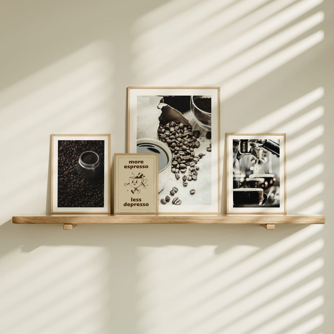 De fotowand straalt een unieke charme uit met zijn koffieafbeeldingen, waarbij elke poster perfect harmonieert met de andere. De kleuren en het licht creëren een kalme en uitnodigende sfeer, waardoor de kamer een gevoel van rust en elegantie krijgt. De verschillende motieven van koffiebonen en kopjes versterken de collectie en geven je kamer een prachtige, door koffie geïnspireerde esthetiek.