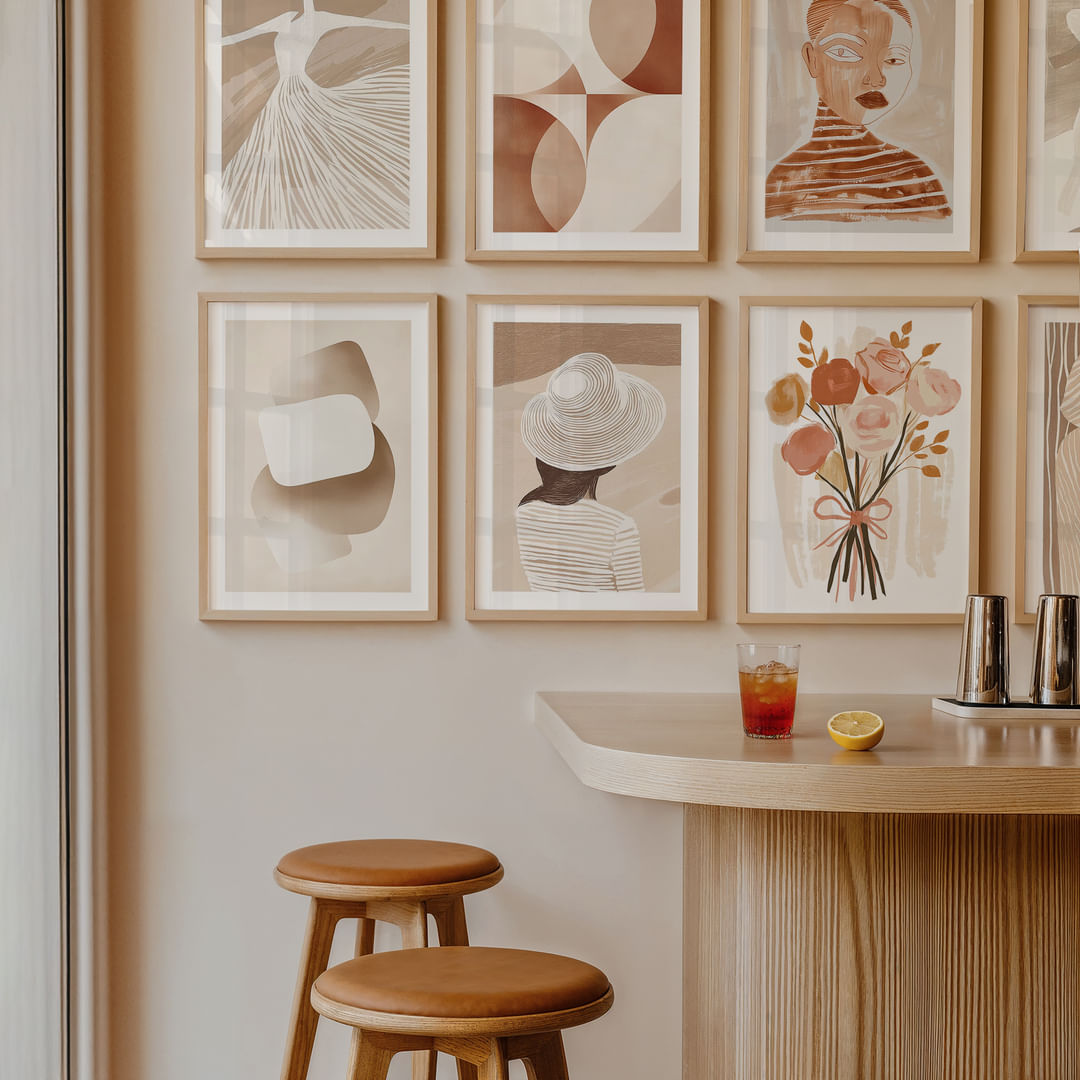 Deze wanddecoratie straalt een ontspannen sfeer uit door de aardse tinten en zachte lijnen. Elke poster staat op zichzelf met unieke patronen die samenkomen in harmonieuze tinten. Het geheel is meditatief en geeft de keuken een verfijnde en rustige uitstraling. Dit creëert een perfecte balans tussen kunst en stijl die elk interieur zal verfraaien.