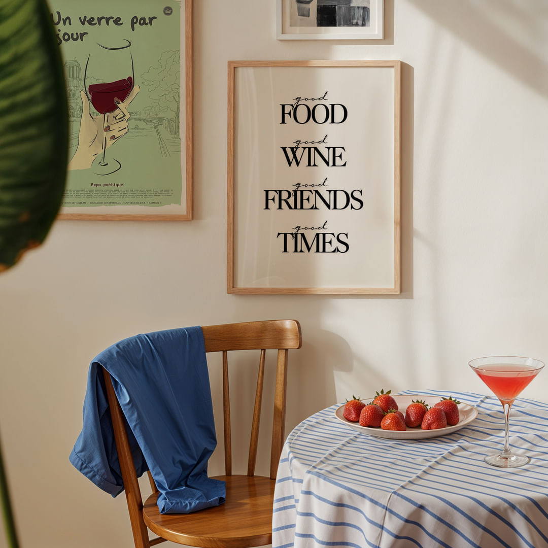 Deze posters combineren elegante typografie met warme, gastvrije elementen die elke keuken verfraaien. De woorden 'lekker eten, wijn en vrienden' harmoniëren met het kleurenpalet van aardse tinten en subtiele contrasten die een gevoel van gemeenschap en vreugde versterken. Perfect voor het creëren van een uitnodigende omgeving waar herinneringen en smaakervaringen worden gedeeld en gewaardeerd.