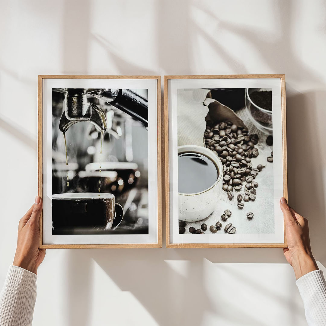 Deze posters creëren een verfijnde sfeer met hun koffietinten en gedetailleerde afbeeldingen. De afbeelding links legt het moment vast waarop een cappuccino wordt ingeschonken, terwijl de afbeelding rechts koffiebonen en een kopje koffie in prachtige harmonie toont. De posters versterken de sfeer van elke kamer door een warme, uitnodigende uitstraling te creëren, perfect voor koffieliefhebbers die zich willen omringen met de passie voor de kunst van het brouwen.
