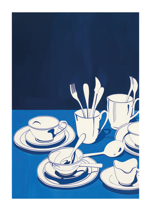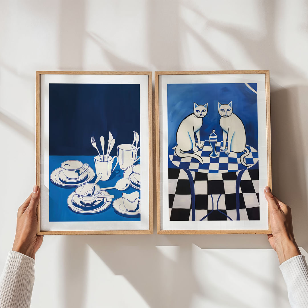Deze posters trekken de aandacht met hun opvallende blauw-witte contrasten die een sfeer van rust en elegantie creëren. De speelse motieven van porselein en katten in een ruitjespatroon geven de kamer een subtiele charme. De strakke en moderne stijl zorgt ervoor dat deze posters perfect passen in zowel moderne als klassieke interieurs en een artistieke en uitnodigende sfeer creëren.