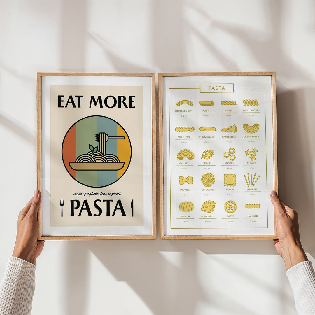 Open de deur naar een wereld vol culinaire inspiratie met deze tweedelige posters die de diversiteit en charme van pasta vastleggen. Met stijlvolle illustraties en de oproep 'Eet meer pasta' wordt elke maaltijd een visueel feest. Deze posters creëren een warme en uitnodigende sfeer, perfect voor de keuken of eetkamer, waar het niet alleen een kunstwerk is, maar ook een bron van dagelijkse inspiratie.