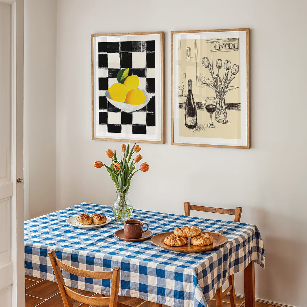 Deze posters geven een frisse en levendige uitstraling, waarbij de gestileerde motieven harmoniëren met hun contrasten en lijnen. Op de ene poster steken felgele tinten citroengeel af tegen zwart-witte vierkanten, terwijl de andere poster rustige elegantie combineert met vintage en schetsmatige details van tulpen en wijnglazen. Samen creëren ze een vernieuwde sfeer in de keuken en complementeren ze de huiselijke stijl.