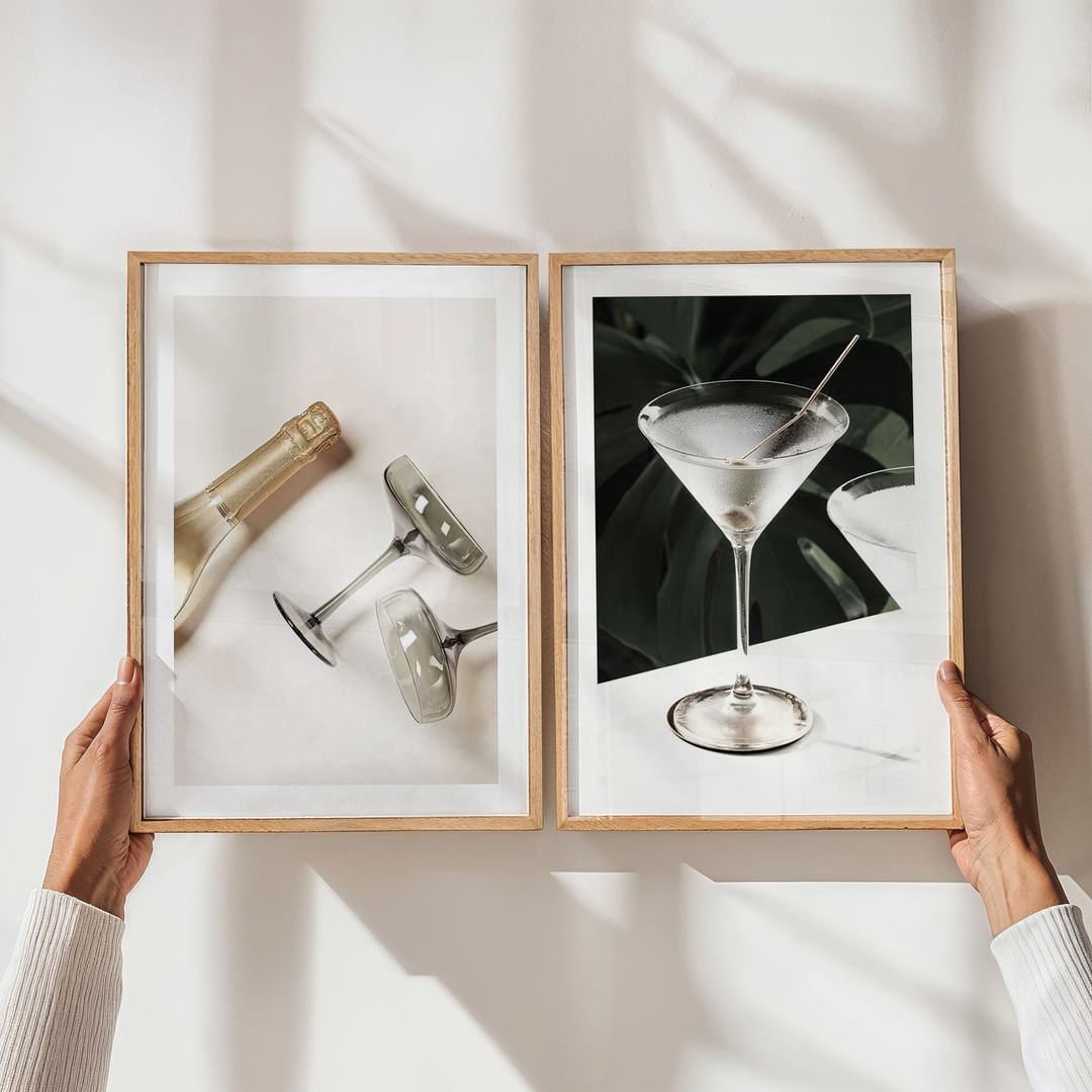 Met een elegante combinatie van licht en schaduw creëren deze posters een gevoel van verfijnde glamour. Aan de linkerkant staat een champagneglas afgebeeld, terwijl aan de rechterkant een martiniglas met een uitnodigend drankje staat. Perfect voor wie luxe en stijl in het dagelijks leven waardeert. Deze posters creëren een feestelijke en exclusieve sfeer en geven elke kamer een verfijnde en charmante uitstraling.