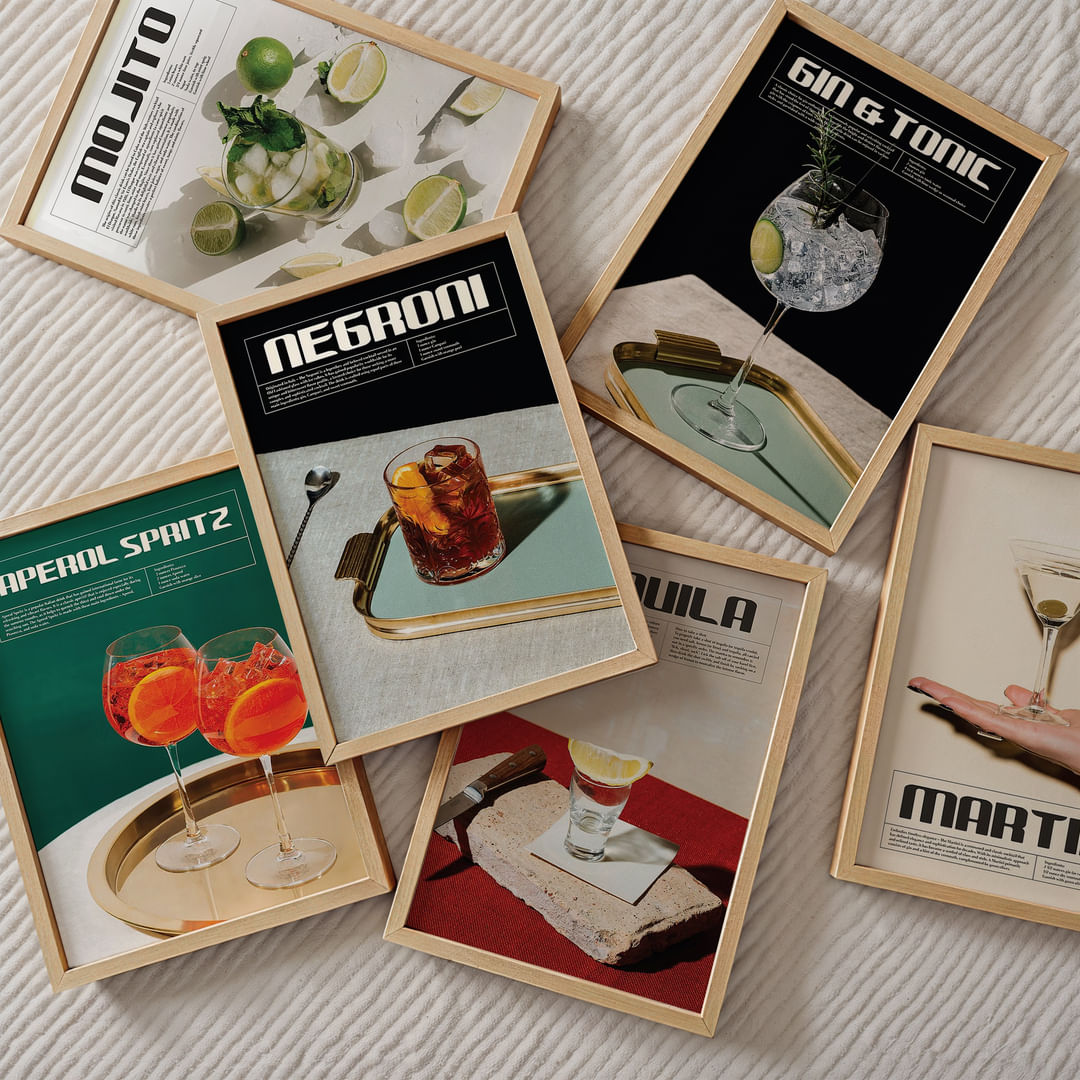 Deze wand vol schilderijen legt de essentie van het feest vast met stijlvolle drankmotieven. Elk schilderij biedt een smaakvolle inkijk in de kunst van de mixologie. Het consistente kleurenpalet van gedurfde en verfijnde tinten creëert een harmonieuze sfeer, terwijl de speelse presentatie van de drankjes uitnodigt tot samenzijn en gesprekken.