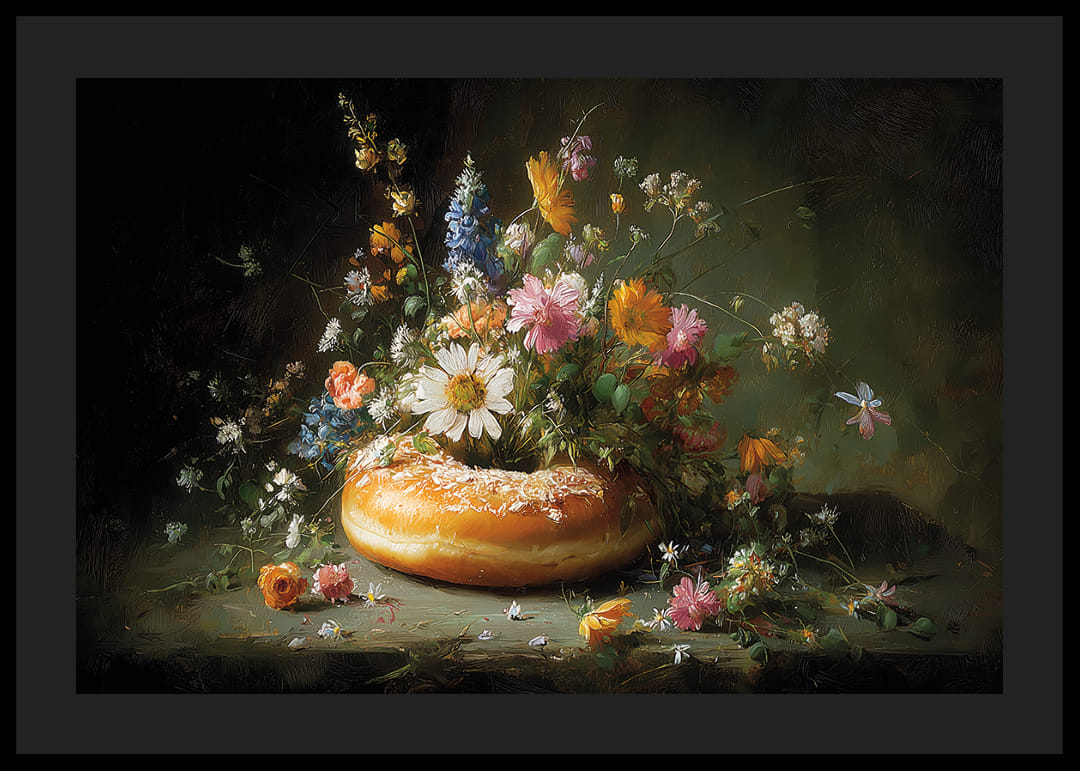 Deze poster legt de betoverende schoonheid vast van een delicate en ongewone combinatie van bloemen en gebak. Levendige bloemen in alle kleuren combineren met een goudgeel gebak, waardoor een harmonieuze mix van kleuren en vormen ontstaat. Met zijn elegante compositie brengt deze poster leven en verfijning in elke kamer en straalt tegelijkertijd een gevoel van tijdloze schoonheid uit.