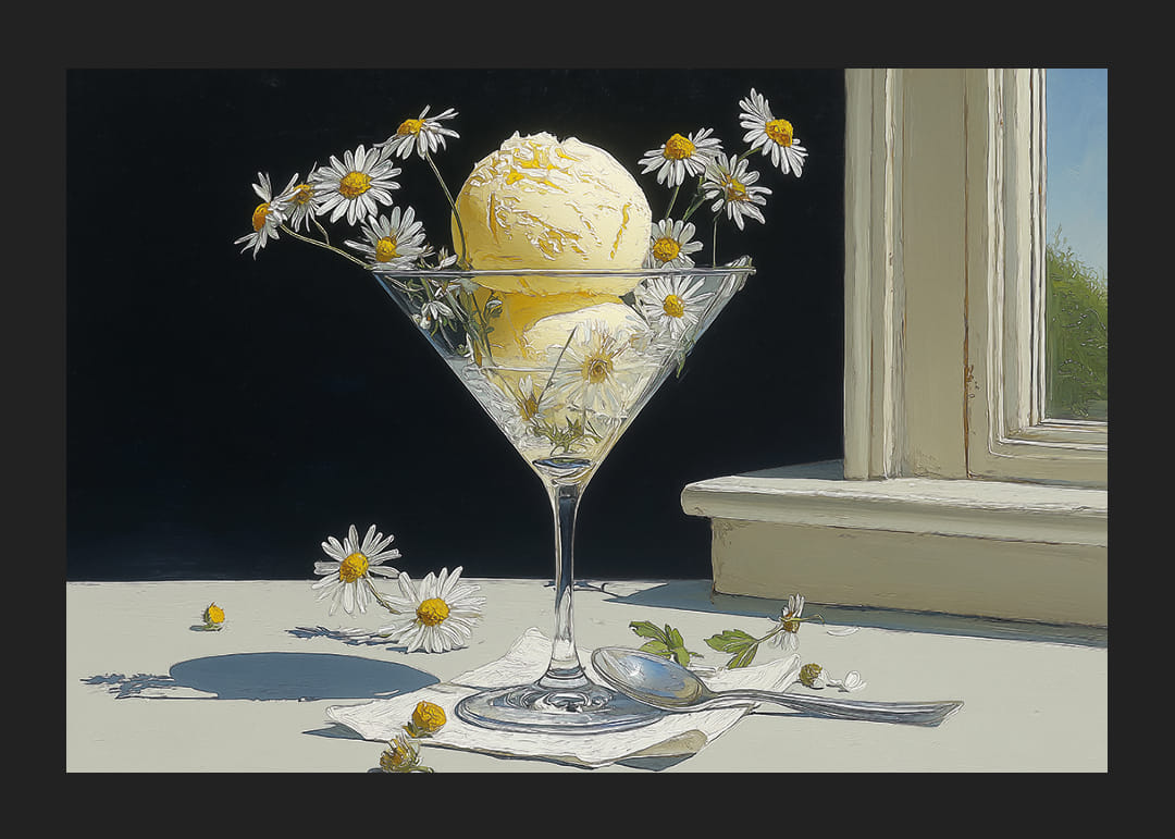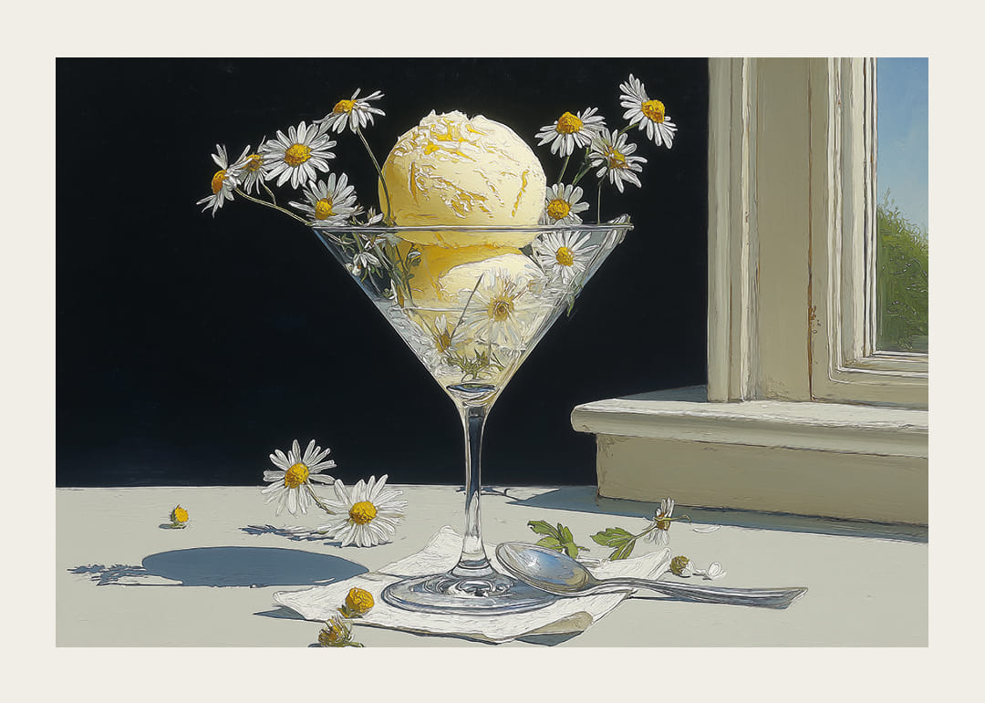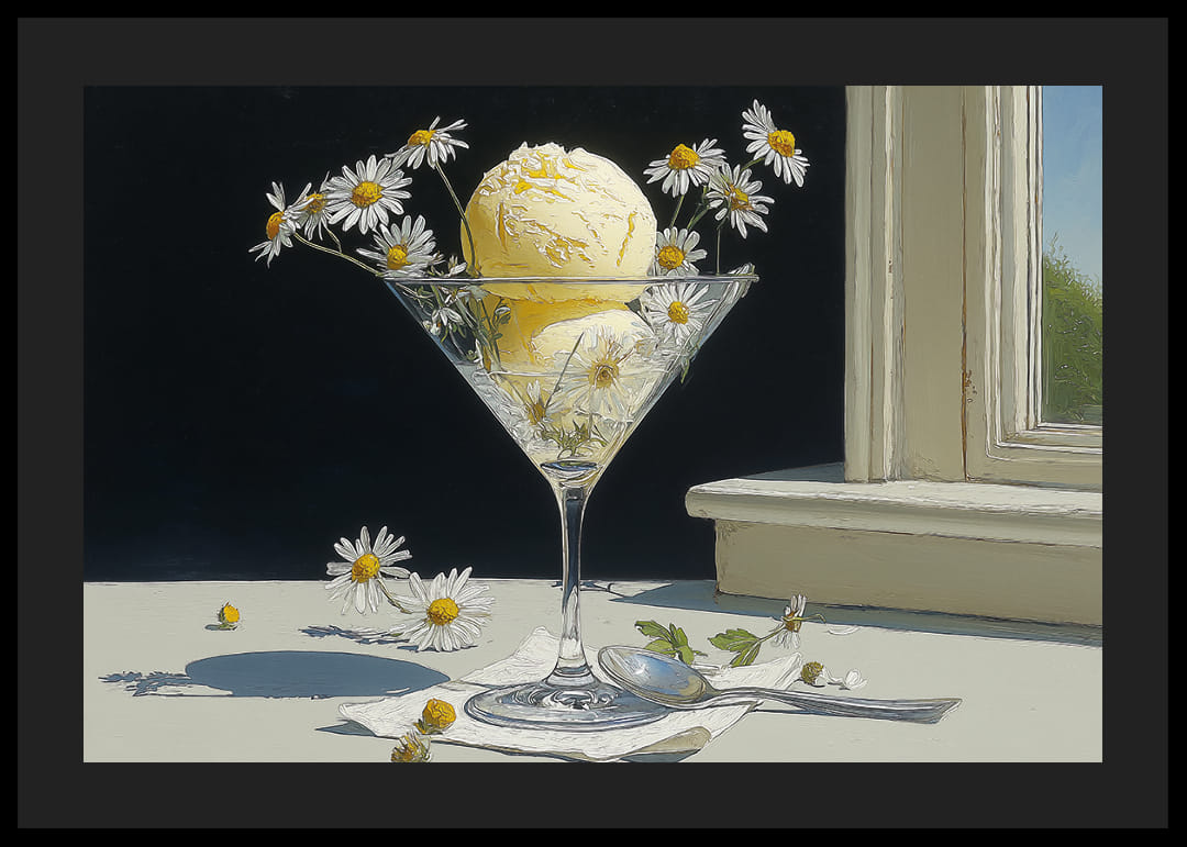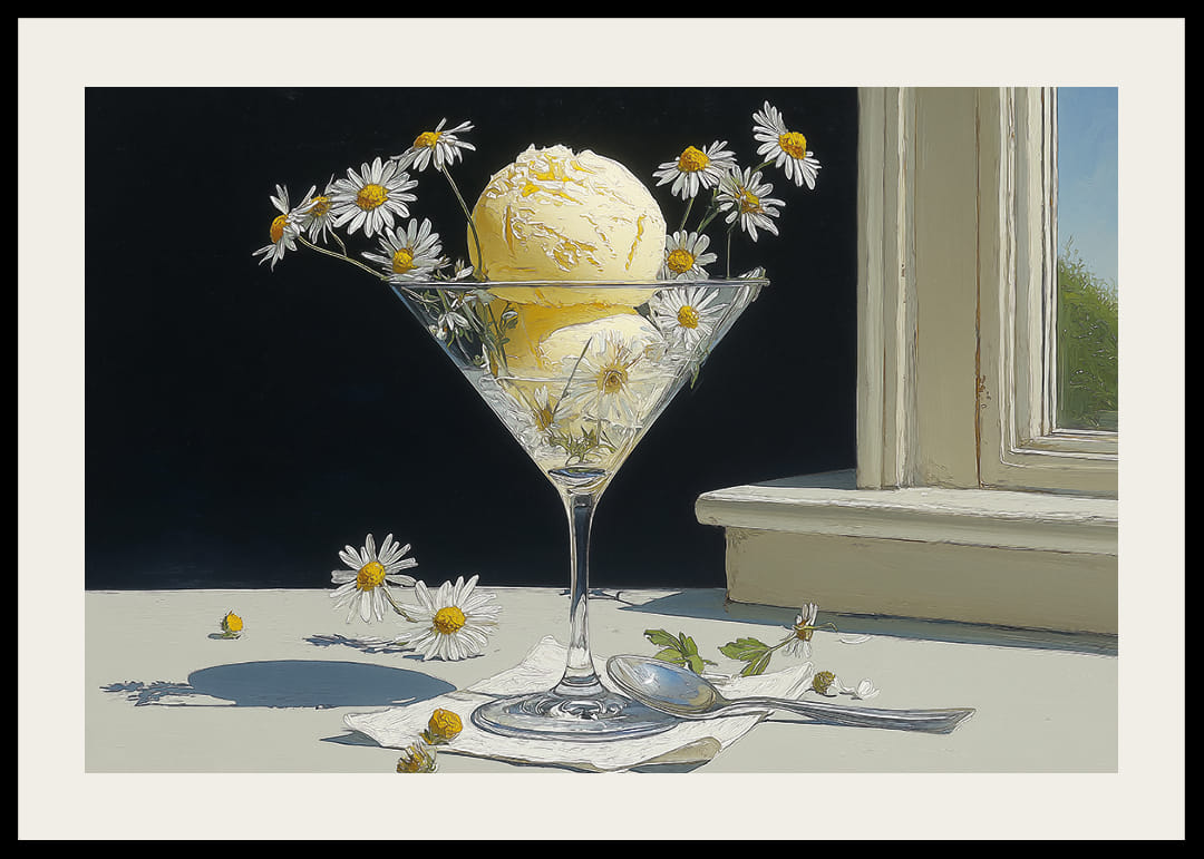 Deze poster trekt de aandacht met zijn frisheid en zomerse harmonie, met een elegante ijsbeker vol romig vanille-ijs versierd met madeliefjes. Het zonlicht creëert een zachte gloed die de schoonheid van de bloemblaadjes en de aantrekkingskracht van het ijs versterkt. Perfect om een ​​gevoel van zomerse rust en natuurlijke charme in huis te halen, zal deze poster een levendig element zijn dat de sfeer in elke kamer versterkt.