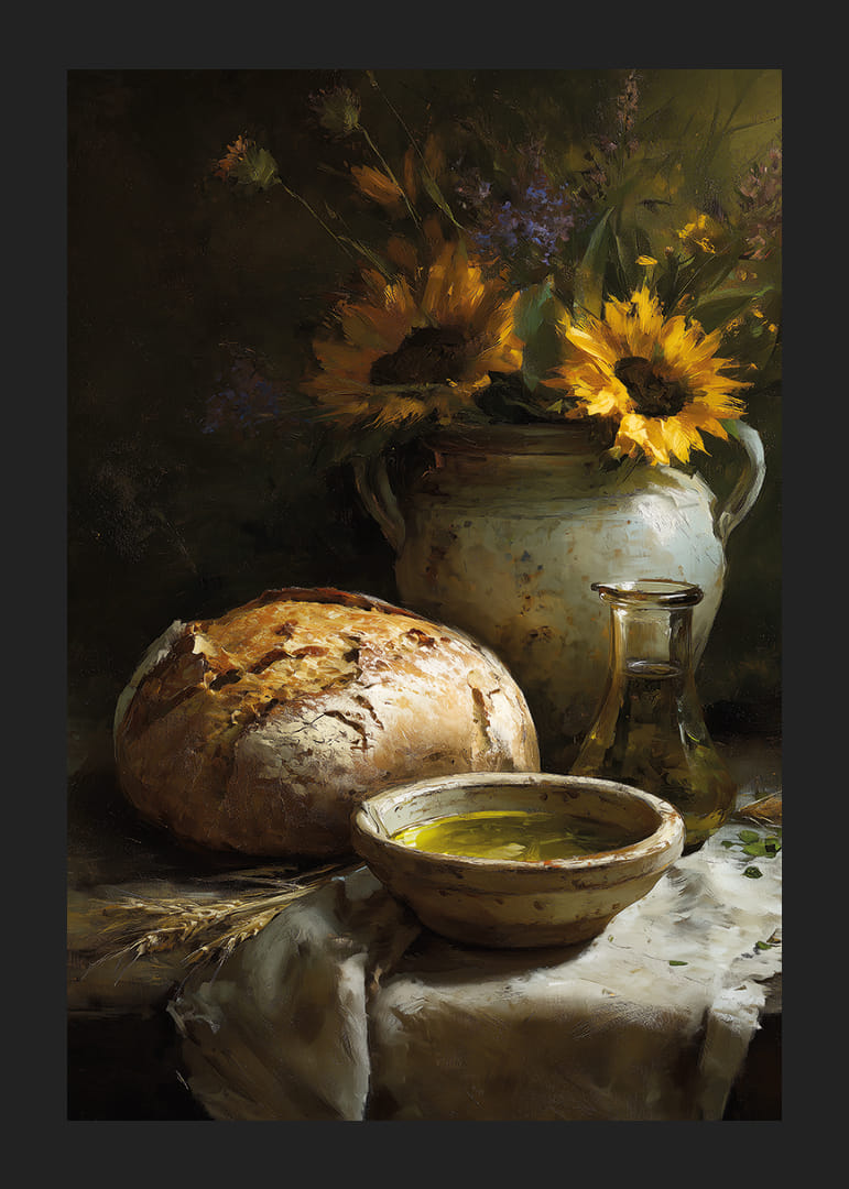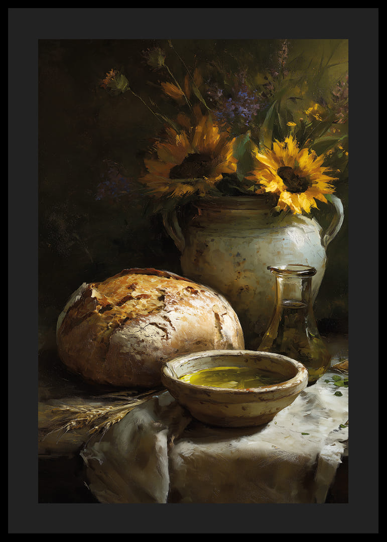 Deze poster trekt de aandacht met zijn stralende zonnebloemen en een rustiek brood dat een huiselijk en gezellig gevoel geeft. De oliefles en de keramische pot voegen een rustieke charme toe te midden van de kleurrijke pracht. De kleuren spelen harmonieus samen en creëren een levendige scène die elke kamer opfleurt. De poster versterkt de sfeer met zijn tijdloze schoonheid en geeft een gevoel van overvloed en harmonie.