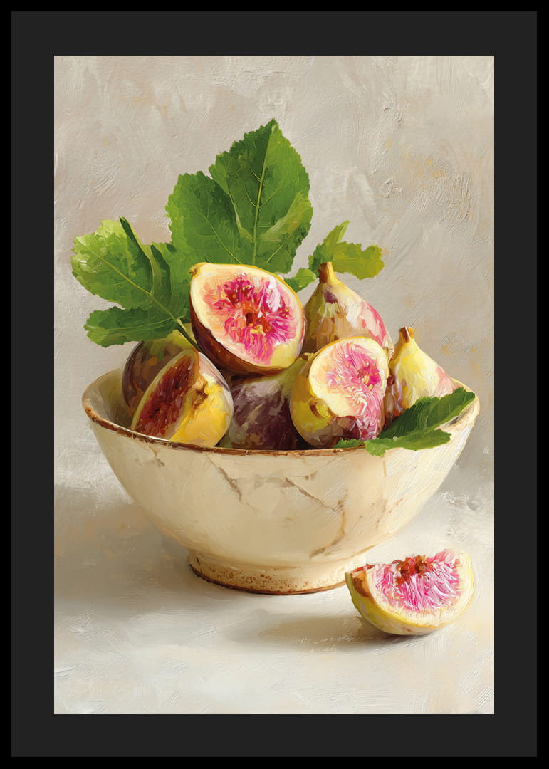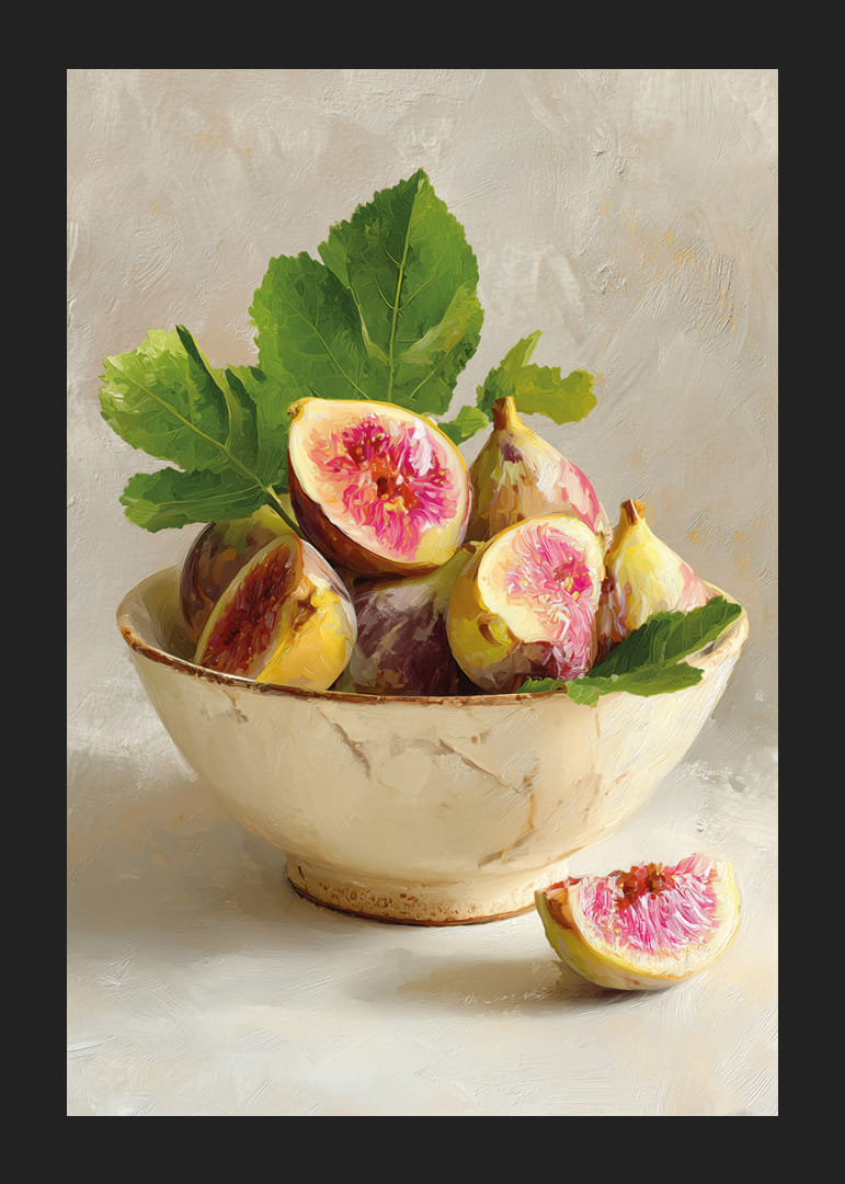 Deze poster legt de tijdloze schoonheid van kleurrijke vijgen in een rustieke schaal vast. Het subtiele contrast tussen de sappige, roze tinten en het zacht geglazuurde porselein creëert een dromerige sfeer. De rijke tinten van de vijgen worden perfect aangevuld door de diepgroene bladeren en nodigen de kijker warm uit. Deze poster tilt je kamer naar een nieuw niveau van elegantie en transformeert elke muur in een kunstwerk.