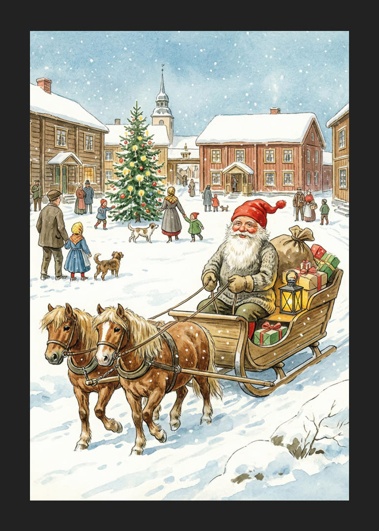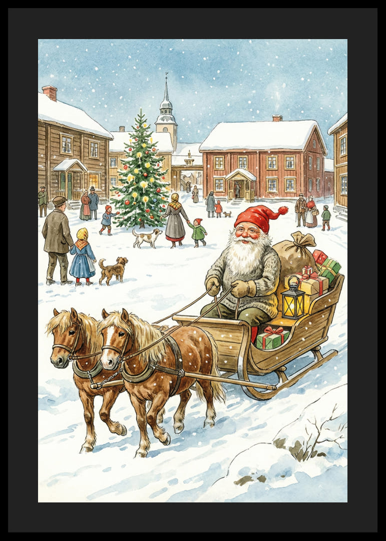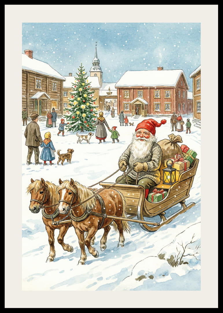 Deze betoverende poster toont de Kerstman, omringd door een idyllisch, besneeuwd dorp, terwijl hij rondreist in zijn slee getrokken door vrolijke paarden. De fonkelende kerstboom en de vrolijke dorpelingen versterken de gastvrije sfeer. Met lichtjes en kleurrijke cadeautjes verspreidt deze poster warmte en kerstsfeer, waardoor hij een mooie aanvulling is op de winterdecoratie van je huis en een gevoel van saamhorigheid creëert.