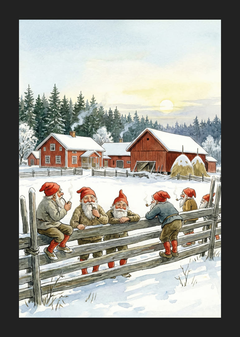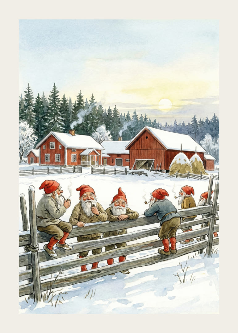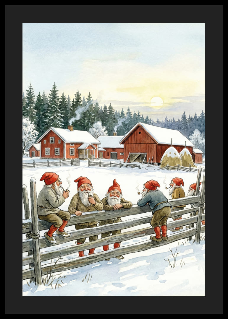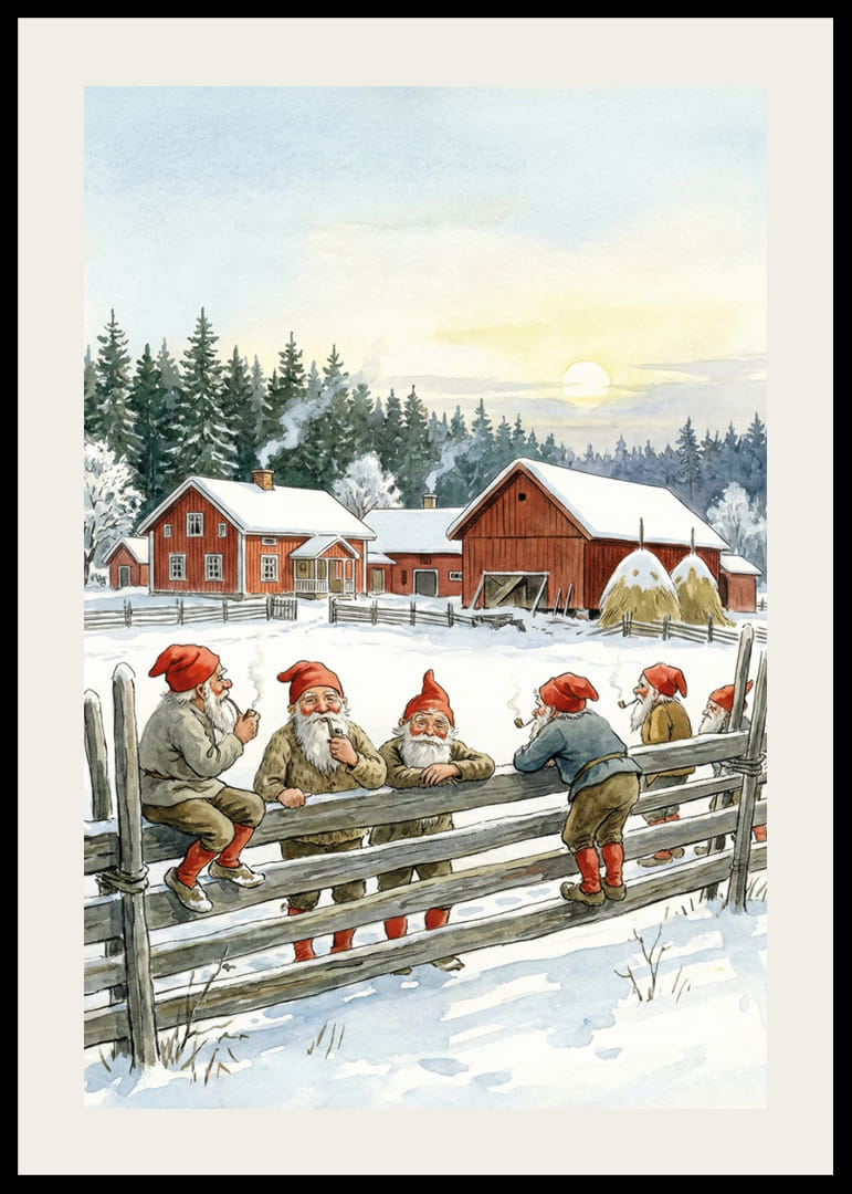 Fonkelend onder de winterhemel verzamelen kleine elfjes zich in een vredig boerderijtafereel. Hun rode mutsen en baarden brengen een verder vredige winterwereld tot leven. Het schemerlicht werpt een gouden gloed over de met sneeuw bedekte huizen en bomen. Deze poster legt het tijdloze gevoel van Scandinavische charme vast en creëert een gezellige sfeer in elk huis. Een perfecte combinatie van traditie en winterse schoonheid voor uw woonkamer.