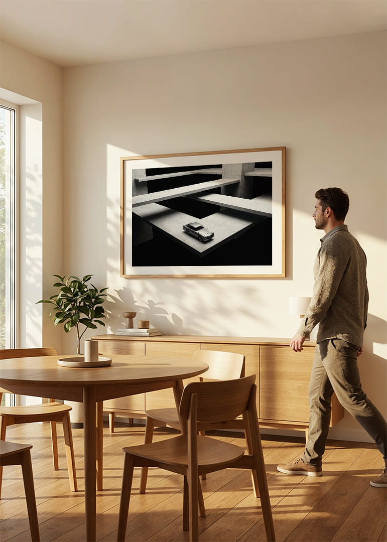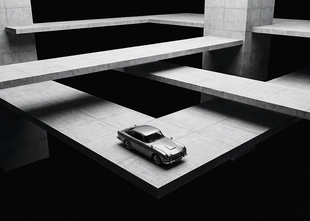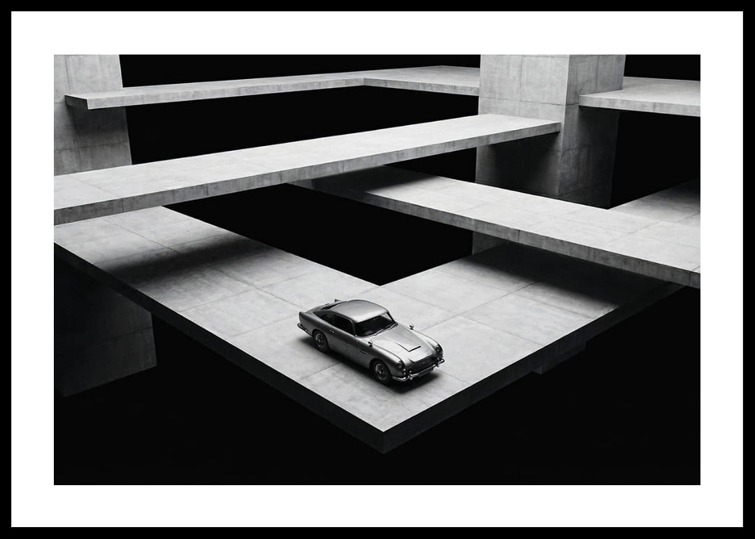 Deze poster toont een tijdloze Aston Martin DB5, elegant geparkeerd op een rij moderne betonnen platforms. Dit is een van 's werelds meest iconische sportwagens, geproduceerd tussen 1963 en 1965. Hij is misschien wel het meest bekend als de ultieme "James Bond-auto", die zijn debuut maakte in de film Goldfinger (1964). Deze poster transformeert elke ruimte in een tijdloze arena en versterkt het gevoel van gedurfd stedelijk design.