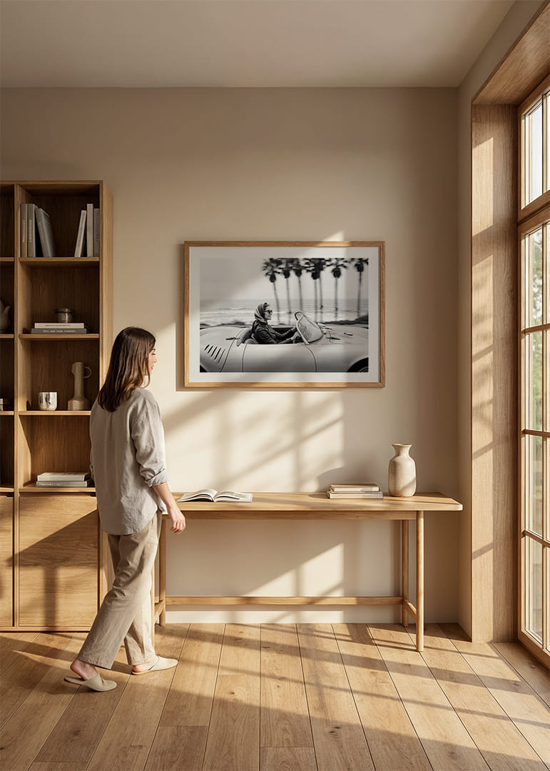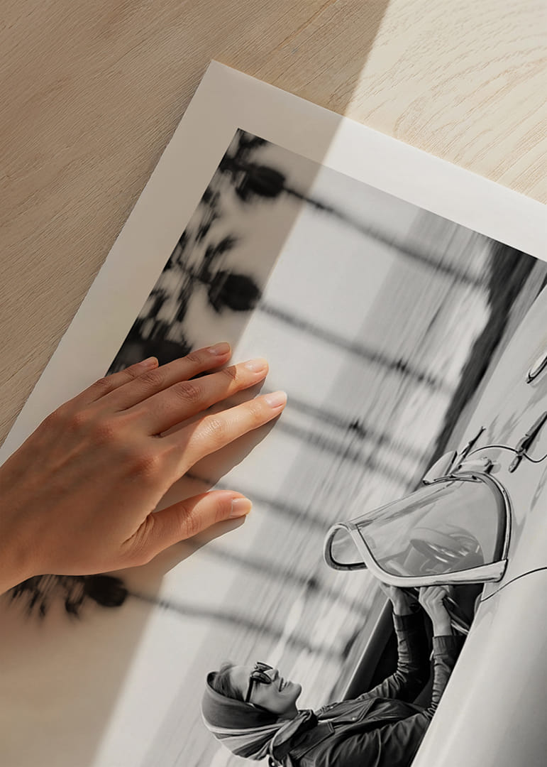 Deze zwart-witposter toont een elegante rit in een Porsche 550 Spyder langs een kustweg, waar een vrouw met zonnebril en sjaal klassieke stijl combineert met de wind van vrijheid. Deze klassieke sportwagen werd tussen 1953 en 1956 door Porsche geproduceerd. Hij staat vooral bekend om zijn extreem lage profiel, de middenmotor en de karakteristieke leren riemen waarmee de motorkap en achterklep worden vastgehouden. Het model is ook historisch bekend als de auto waarin acteur James Dean reed toen hij in 1955 omkwam bij een auto-ongeluk. De poster vangt de elegante esthetiek van de jaren 50.