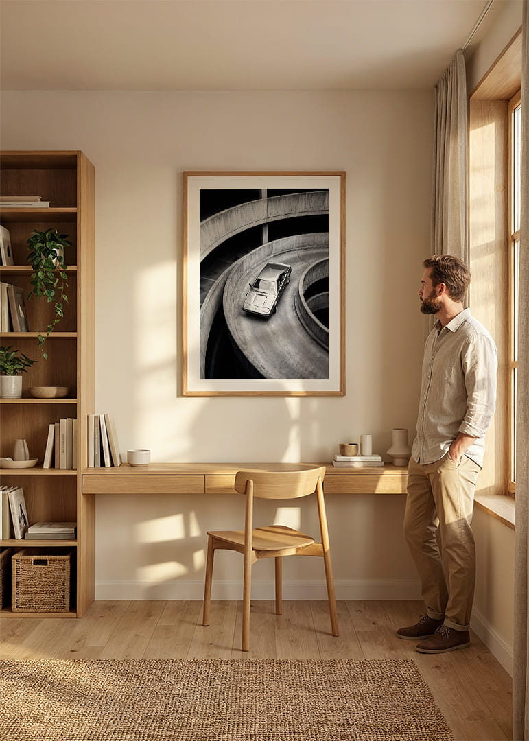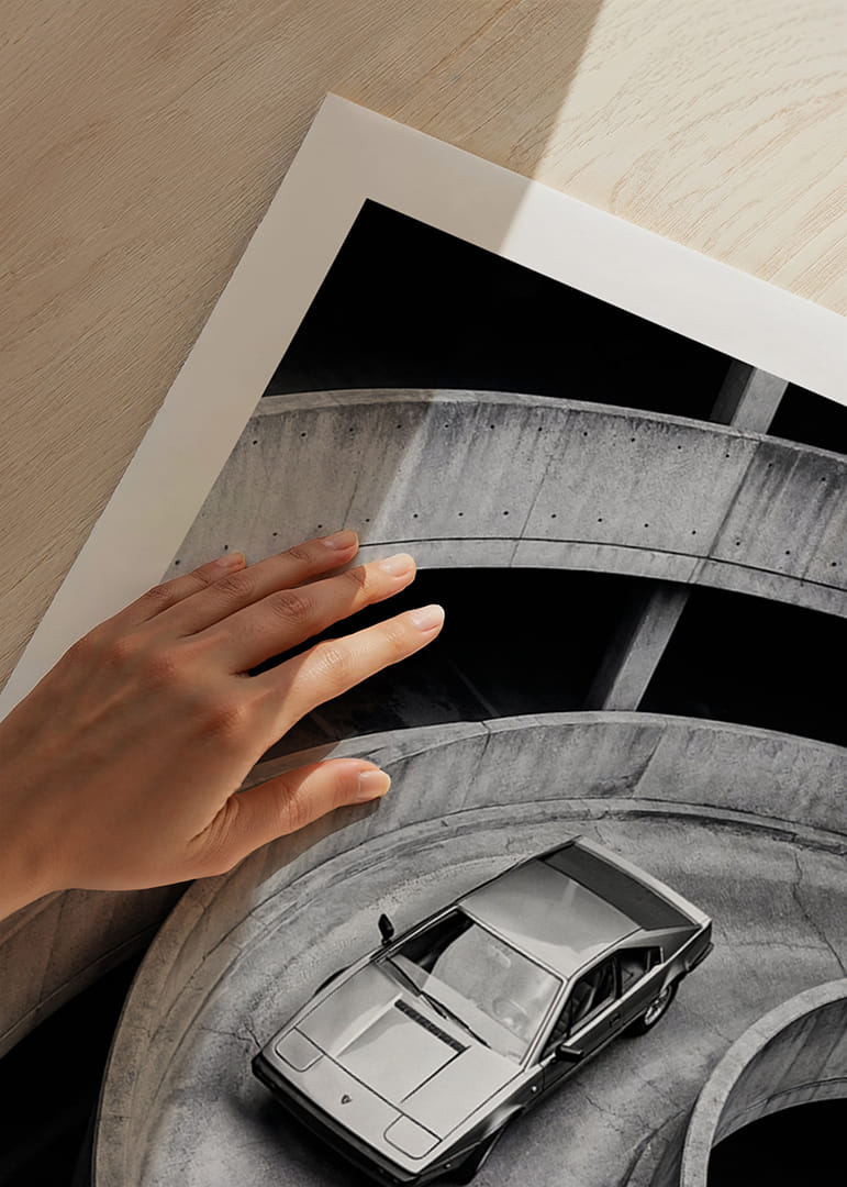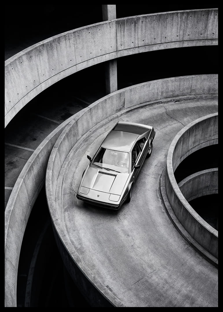 In een fascinerend samenspel van lijnen en rondingen neemt deze poster de kijker mee naar een wereld van moderne architectuur en elegantie. De zilveren Lamborghini Jalpa rijdt gracieus over de spiraalvormige betonnen weg en benadrukt zowel kracht als schoonheid. De poster voegt een gevoel van beweging en verfijning toe aan elke ruimte, waardoor het een blikvanger en een bron van inspiratie wordt.