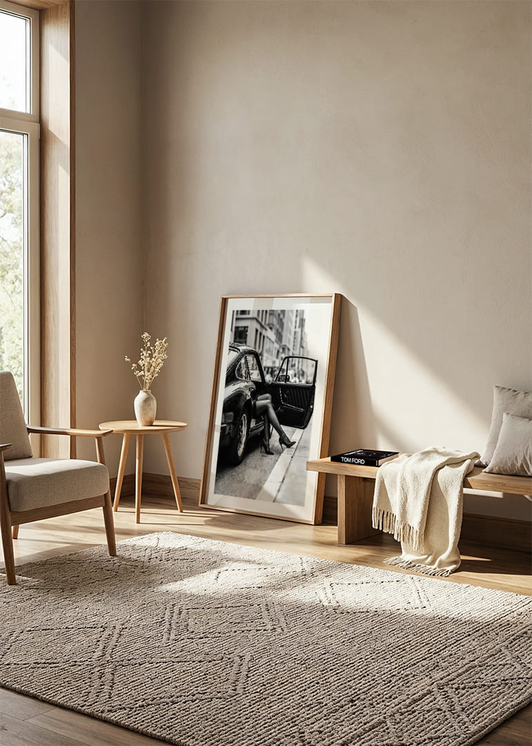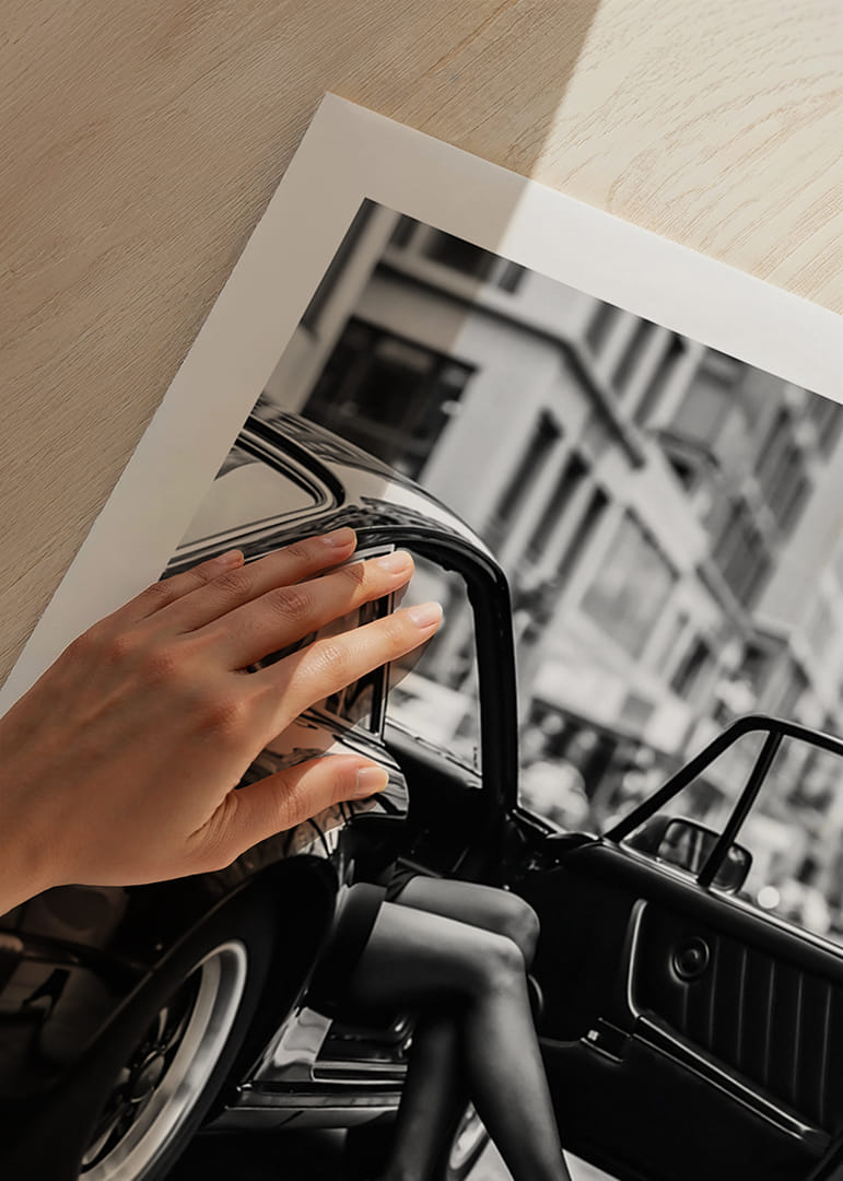 Deze prachtige poster legt de elegantie van het stadslandschap vast, met de focus op een paar benen die elegant uit een auto steken. Het automodel op de poster is een Porsche 911, meer specifiek uit de G-serie (geproduceerd tussen 1974 en 1989). De zwart-wit compositie benadrukt het contrast tussen de glanzende auto en de levendige stadsachtergrond. Deze poster voegt een tijdloze verfijning toe aan de ruimte en brengt een gevoel van stedelijke stijl en dynamiek in elke hoek van uw huis.