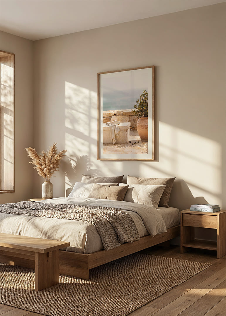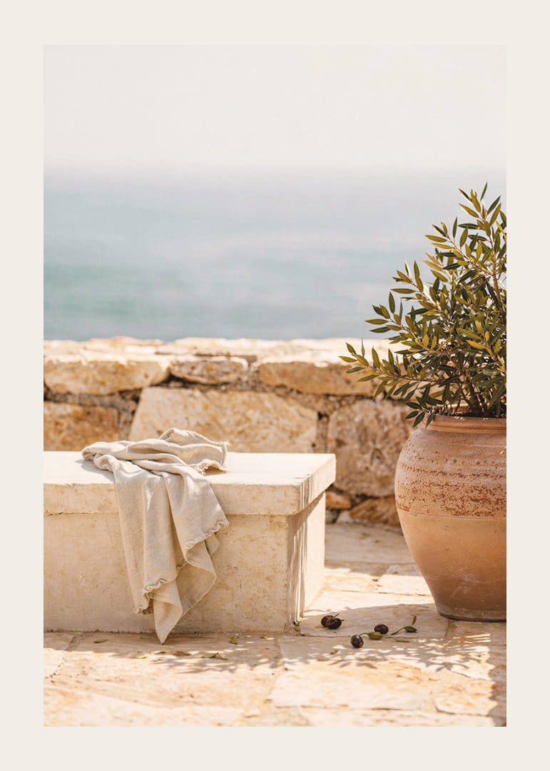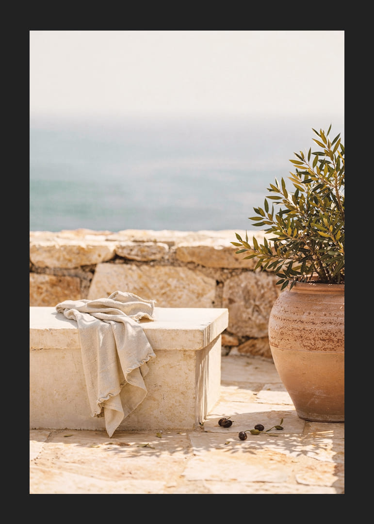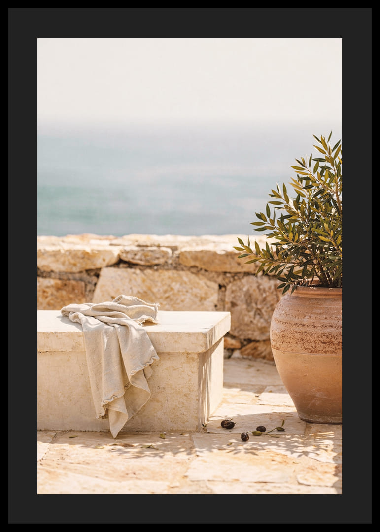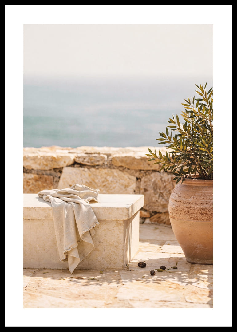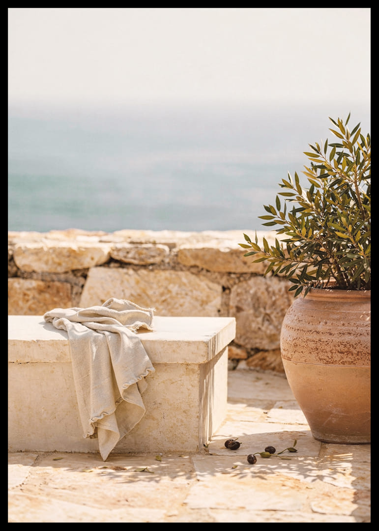Deze poster vangt een rustgevende mediterrane sfeer met een stenen bankje aan zee en een elegante terracotta pot. De zachte kleuren en de ontspannen, maar toch verfijnde stijl creëren een gevoel van kalmte en harmonie. Perfect om een ​​comfortabele en vredige sfeer in huis te brengen. Deze poster, een herinnering aan de eenvoudige schoonheid van de kust, tovert elke kamer om tot een oase van rust.