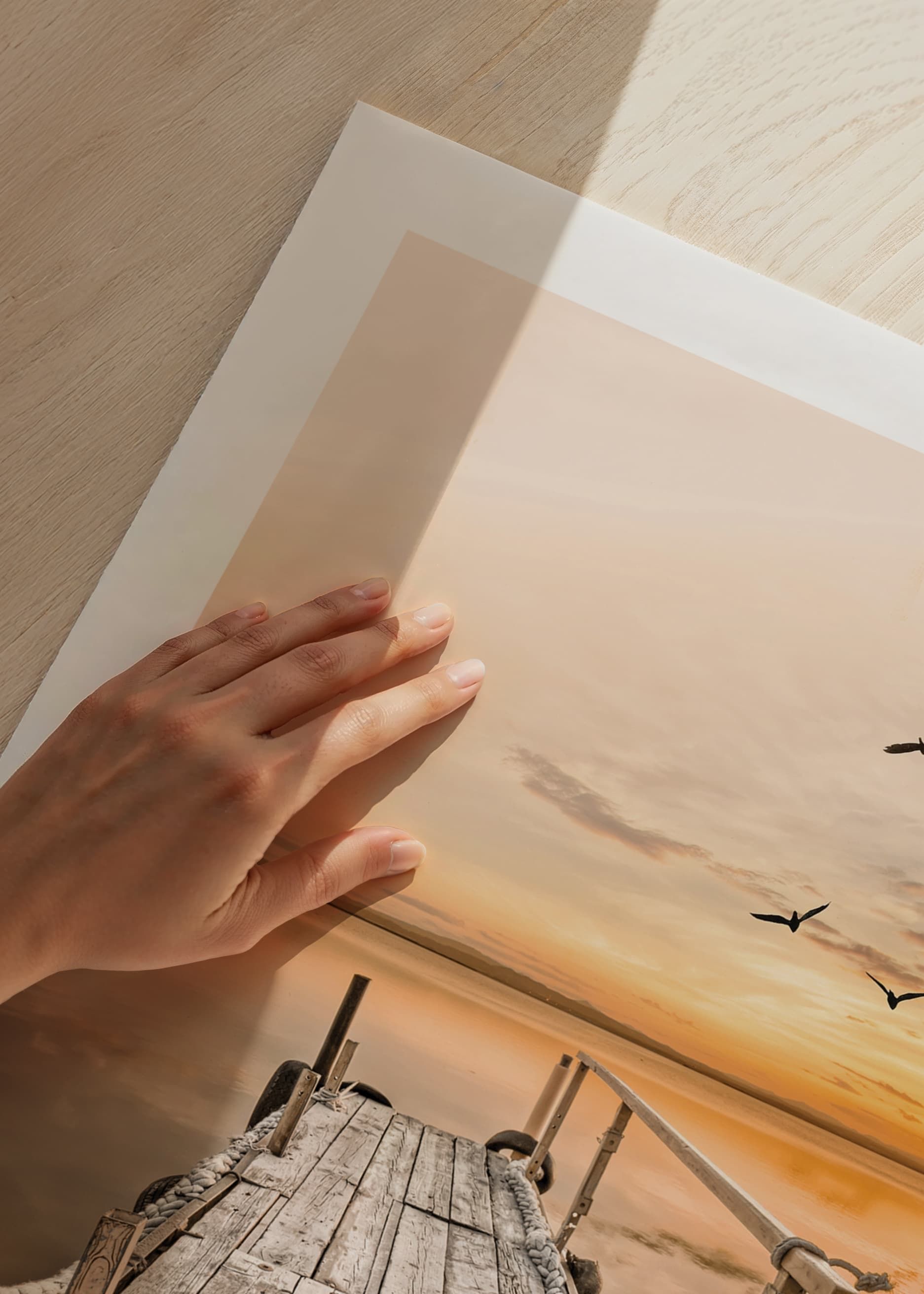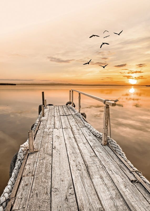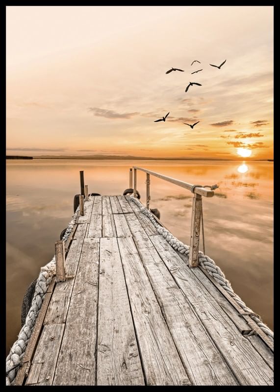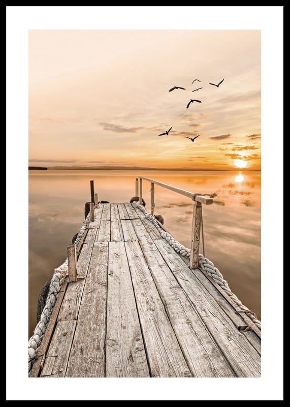 Een versleten houten pier strekt zich uit over een spiegelend waterlandschap terwijl de zon ondergaat aan de horizon en de lucht warm oranje kleurt. Een paar vogels zweven boven het water. Met zijn zachte tinten past deze poster goed in een woonkamer of hal waar een rustige, natuurlijke sfeer wordt gewaardeerd.