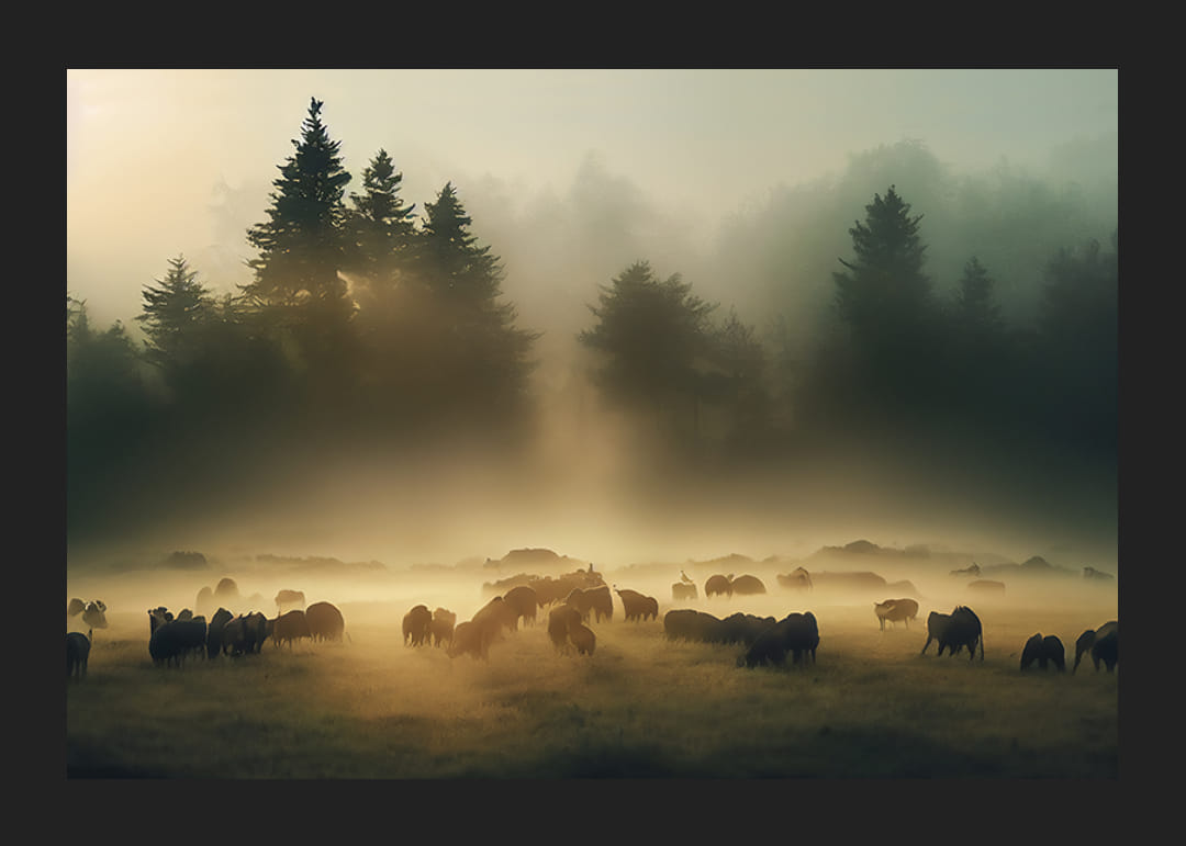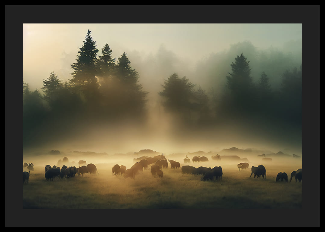 Een groot aantal schapen graast in een open weide in de ochtendmist, terwijl zachte zonnestralen door de bomen op de achtergrond breken. Doffe groene en gele tinten ontmoeten het wazige licht en creëren een vredig landschapsmotief. Deze poster geeft een natuurlijke sfeer en is geschikt voor kamers waar u de rust van de natuur wilt benadrukken.