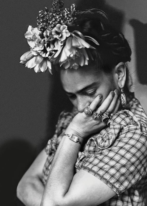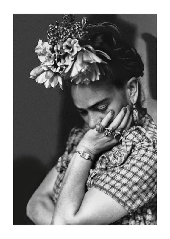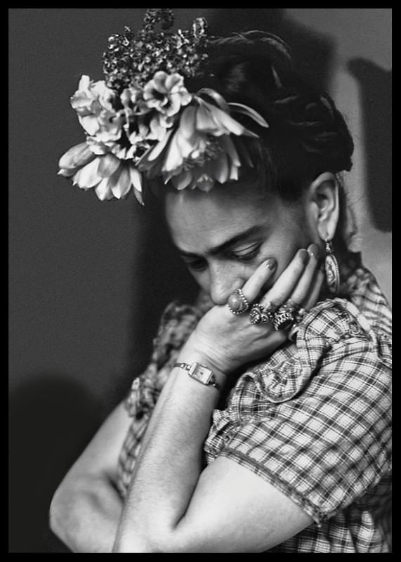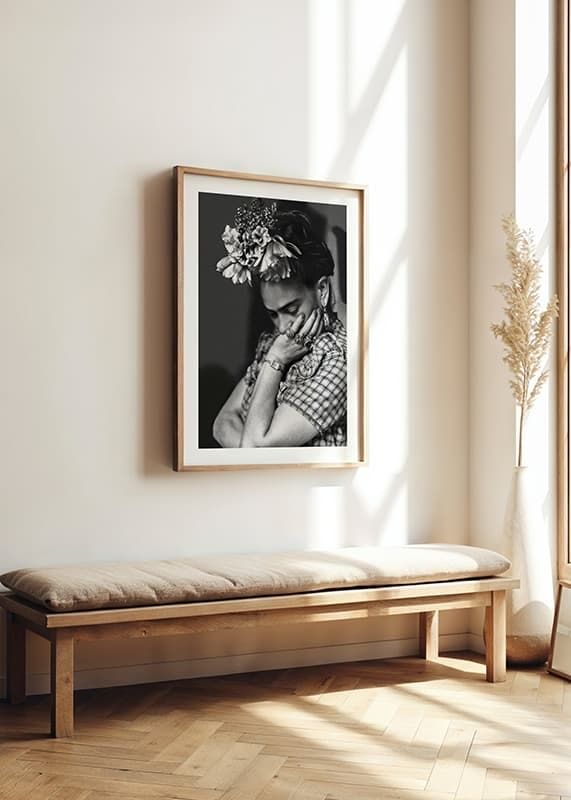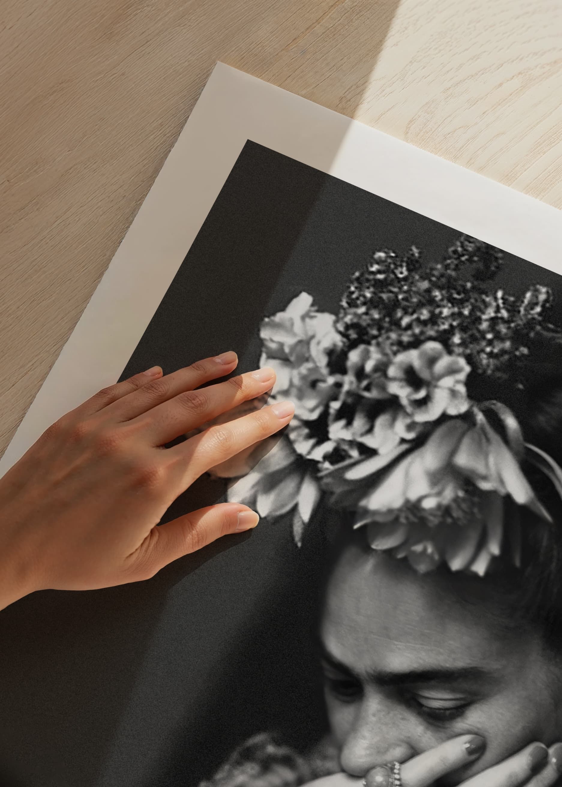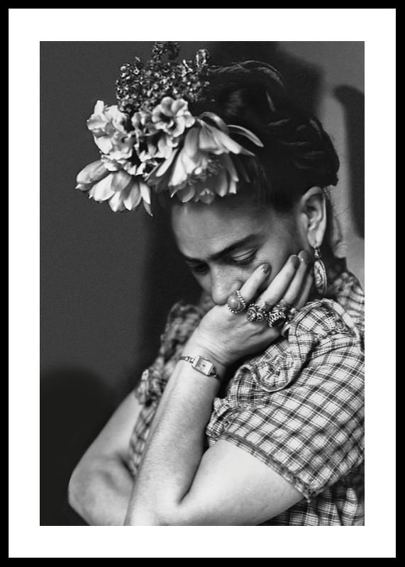 Poster uit de categorie fotokunst met een iconische foto van de kunstenaar Frida Kahlo. Frida Kahlo, een Mexicaanse schilder geboren in 1907, ontpopte zich als een van de beroemdste en meest invloedrijke kunstenaars van de 20e eeuw. Haar unieke stijl, levendige kleuren en diep introspectieve werken hebben de aandacht van het publiek getrokken en blijven generaties kunstenaars over de hele wereld inspireren. Ondanks dat ze haar hele leven met talloze fysieke en emotionele uitdagingen te maken kreeg, kanaliseerde Frida Kahlo haar pijn, passie en doorzettingsvermogen in haar kunst. Ze kreeg in haar tienerjaren een verlammend busongeluk, resulterend in ernstige lichamelijke kwalen, chronische pijn en een leven vol operaties. Deze ervaringen hadden een sterke invloed op haar kunst, die vaak haar fysieke en emotionele lijden verbeeldde. Kahlo's werk onderzoekt thema's als identiteit, gender en postkolonialisme. Haar zelfportretten worden gekenmerkt door surrealistische elementen, levendige symboliek en een sterk visueel verhaal dat haar innerlijke gevoelens weerspiegelt. Ze gebruikte haar kunst als een medium voor zelfexpressie, waarbij ze zowel haar persoonlijke worstelingen als bredere sociale kwesties onderzocht. Frida Kahlo's unieke perspectief en intense symboliek hebben haar tot een icoon gemaakt voor de feministische en LGBTQ+-bewegingen. Haar gedurfde mode-keuzes, waaronder traditionele Mexicaanse kleding en kenmerkende wenkbrauwen, daagden de conventionele schoonheidsnormen uit en vierden haar culturele erfgoed.