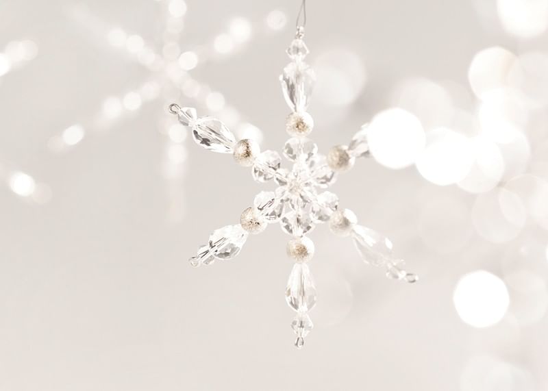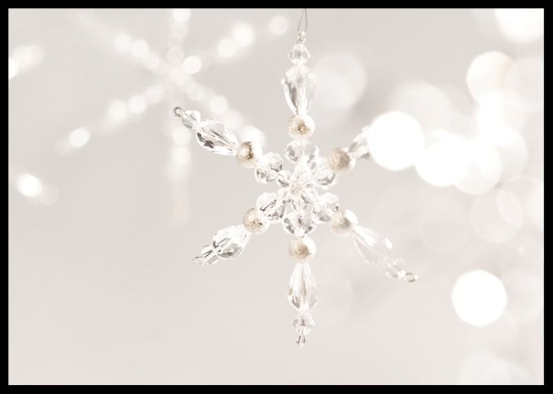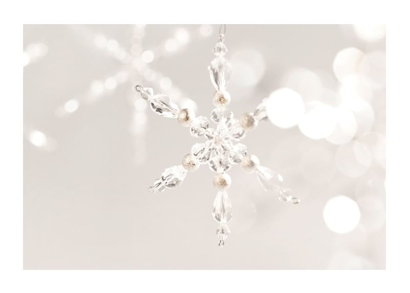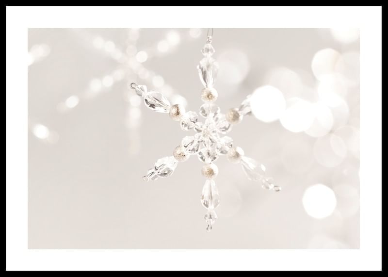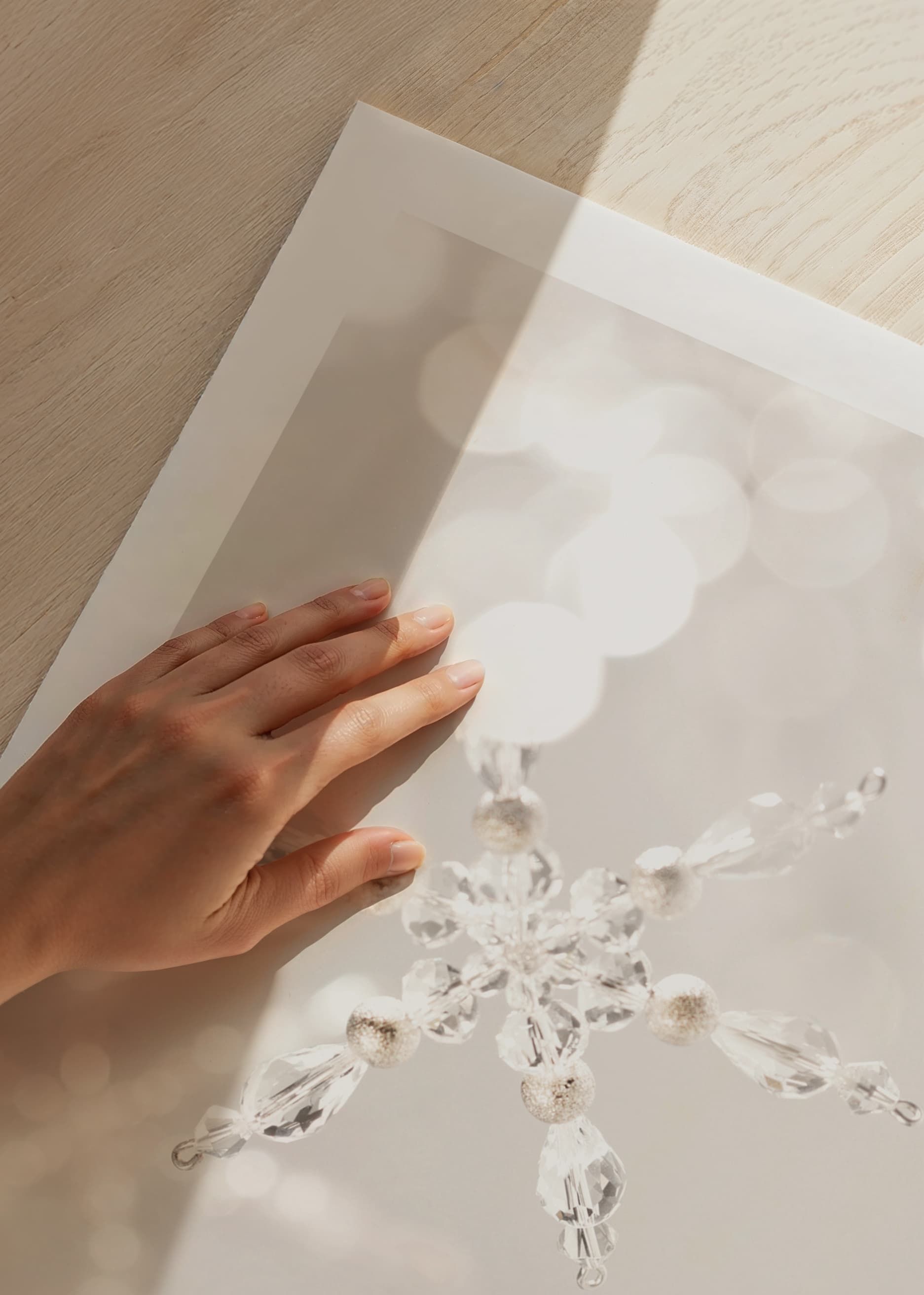 Een glasachtige sneeuwvlokdecoratie met sprankelende details hangt vrij tegen een wazige, lichte achtergrond. De heldere vormen en zilverachtige tinten benadrukken een winters thema. Deze poster voegt een luchtige en stijlvolle sfeer toe aan huis, vooral in de winter en tijdens Kerstmis, en is geschikt voor zowel de woonkamer als de hal.