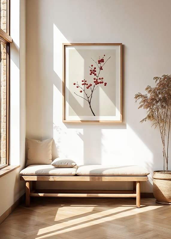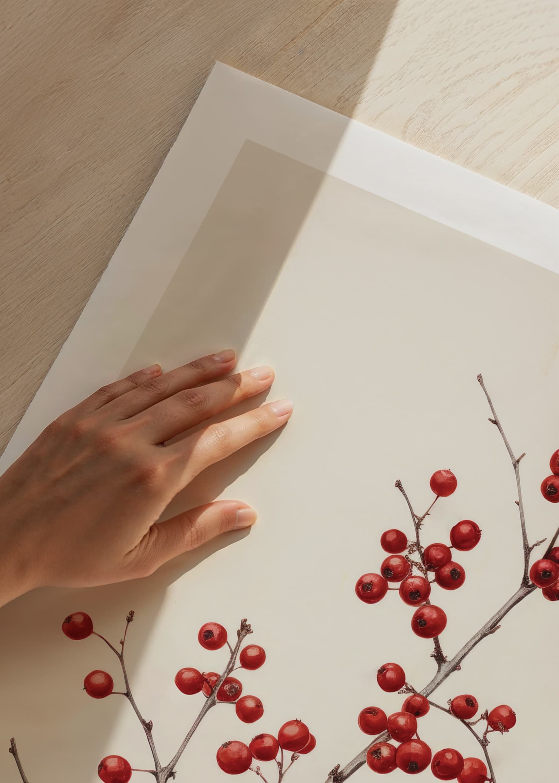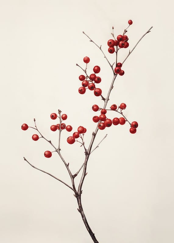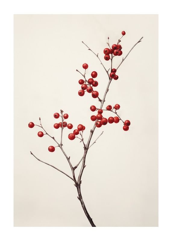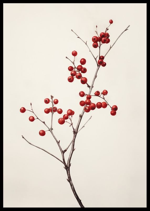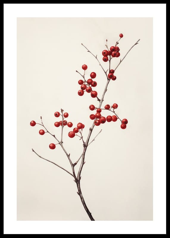 Een dun vertakt takje met felrode bessen in groepjes op een eenvoudige lichtbeige achtergrond. Het motief geeft een winters gevoel met zijn minimalistische uitstraling en natuurlijke kleurenschema. Deze poster past goed in de hal, woonkamer of keuken, waar je een stijlvol en seizoensgebonden element wilt creëren.