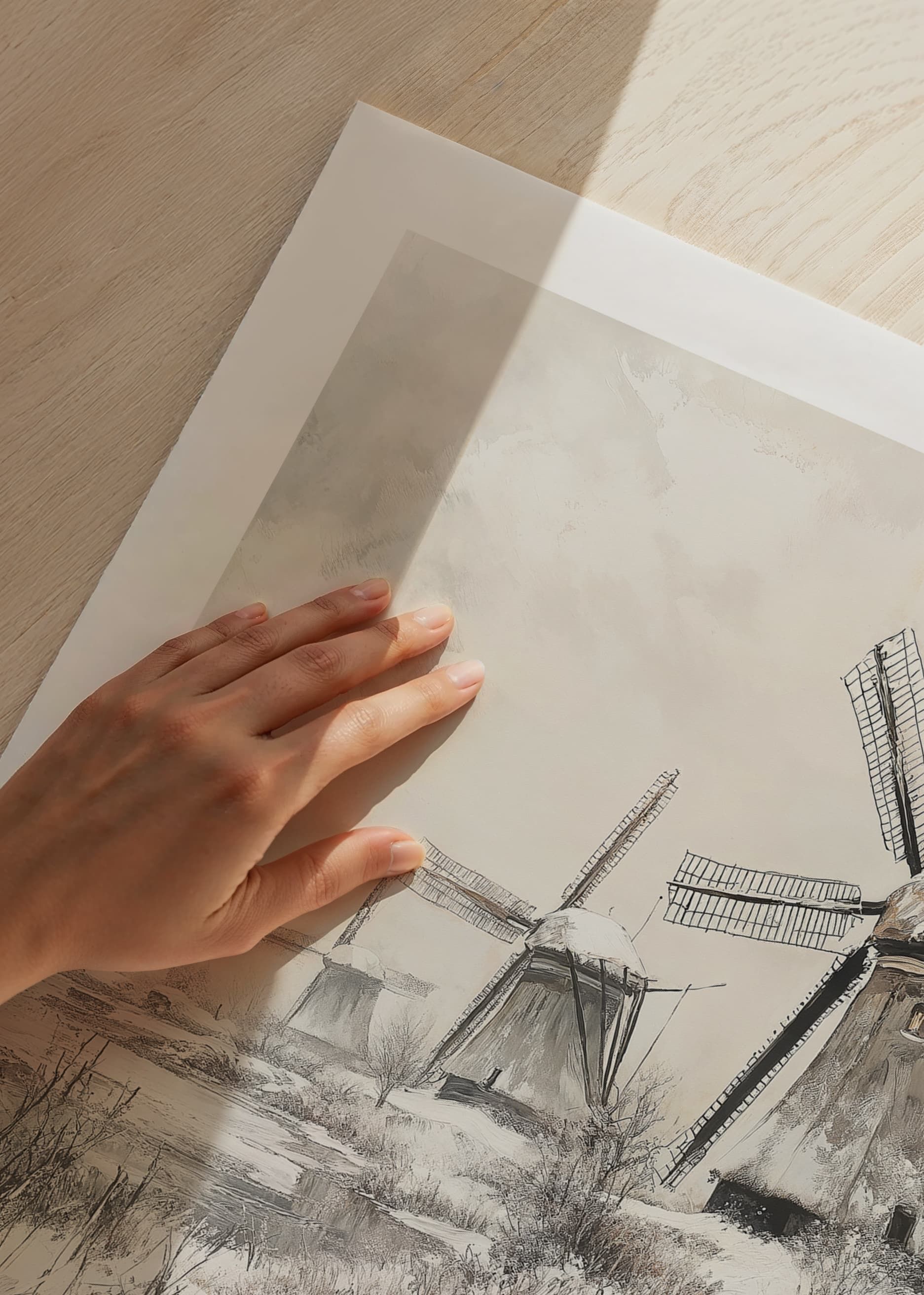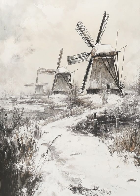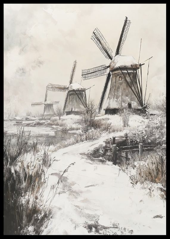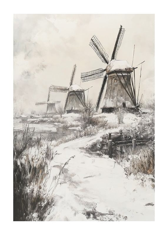 Drie windmolens staan ​​op een rij langs een smal, kronkelend pad, omringd door een besneeuwd winterlandschap. Zachte beige- en grijstinten geven een ingetogen en vredige sfeer. Windstille bomen en een met rijp bedekte grond domineren het motief. Deze poster is zeer geschikt voor ruimtes waar een rustige en tijdloze sfeer gewenst is.