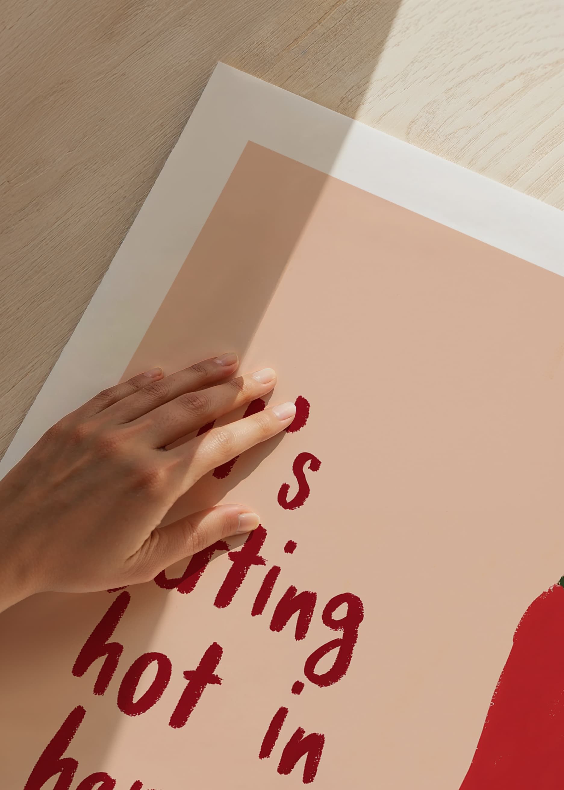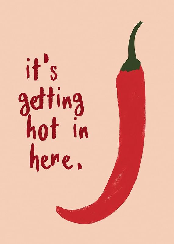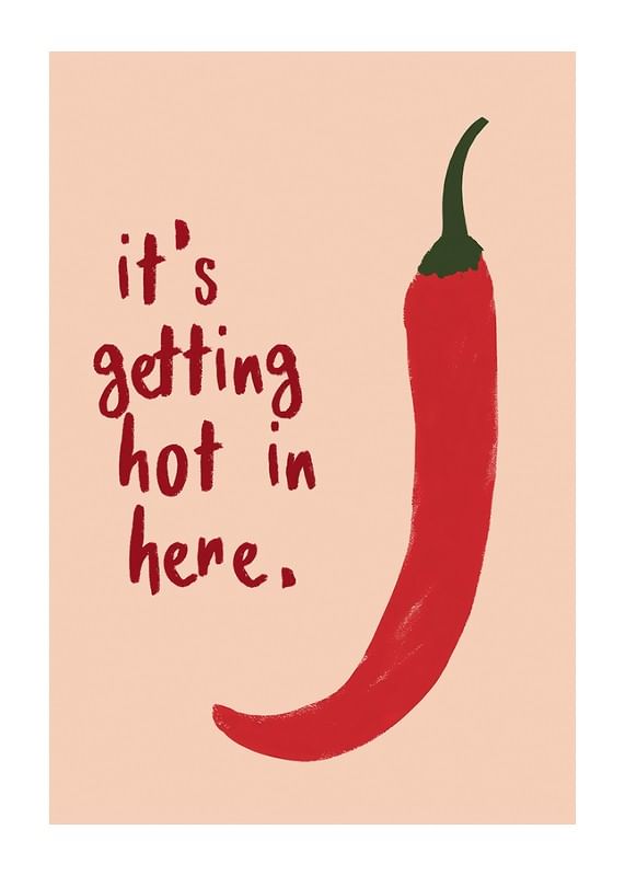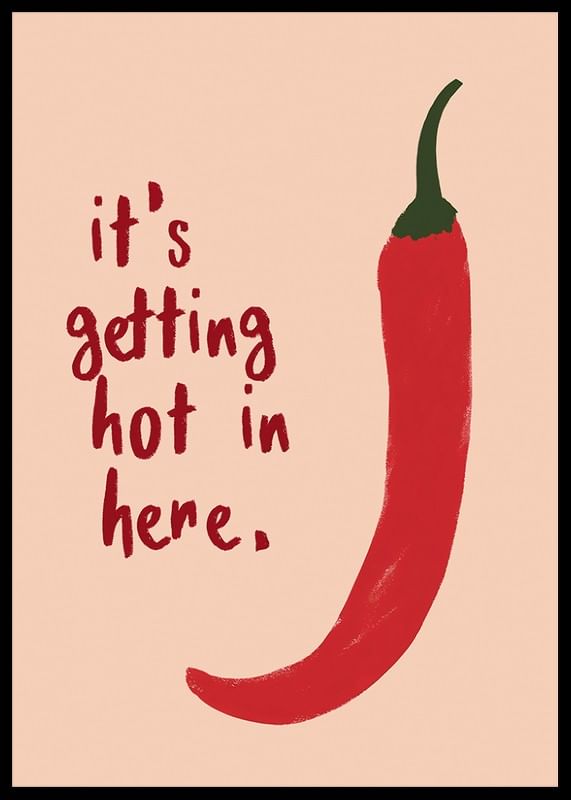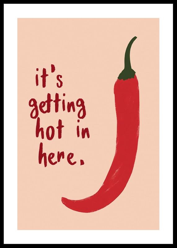 Poster met een gestileerde afbeelding van een rode chili tegen een warme, lichte achtergrond en de tekst "it's getting hot in here." geschreven in een ontspannen, handgeschreven stijl. De kleur van de tekst harmonieert met de kleur van de chili, wat een uniform en speels gevoel geeft. De bewoording van de tekst kan letterlijk worden geïnterpreteerd, als verwijzing naar de hitte van de chili, of figuurlijk, als een toespeling op toenemende spanning of sfeer in de kamer.