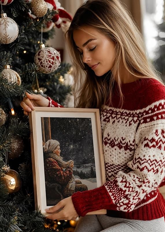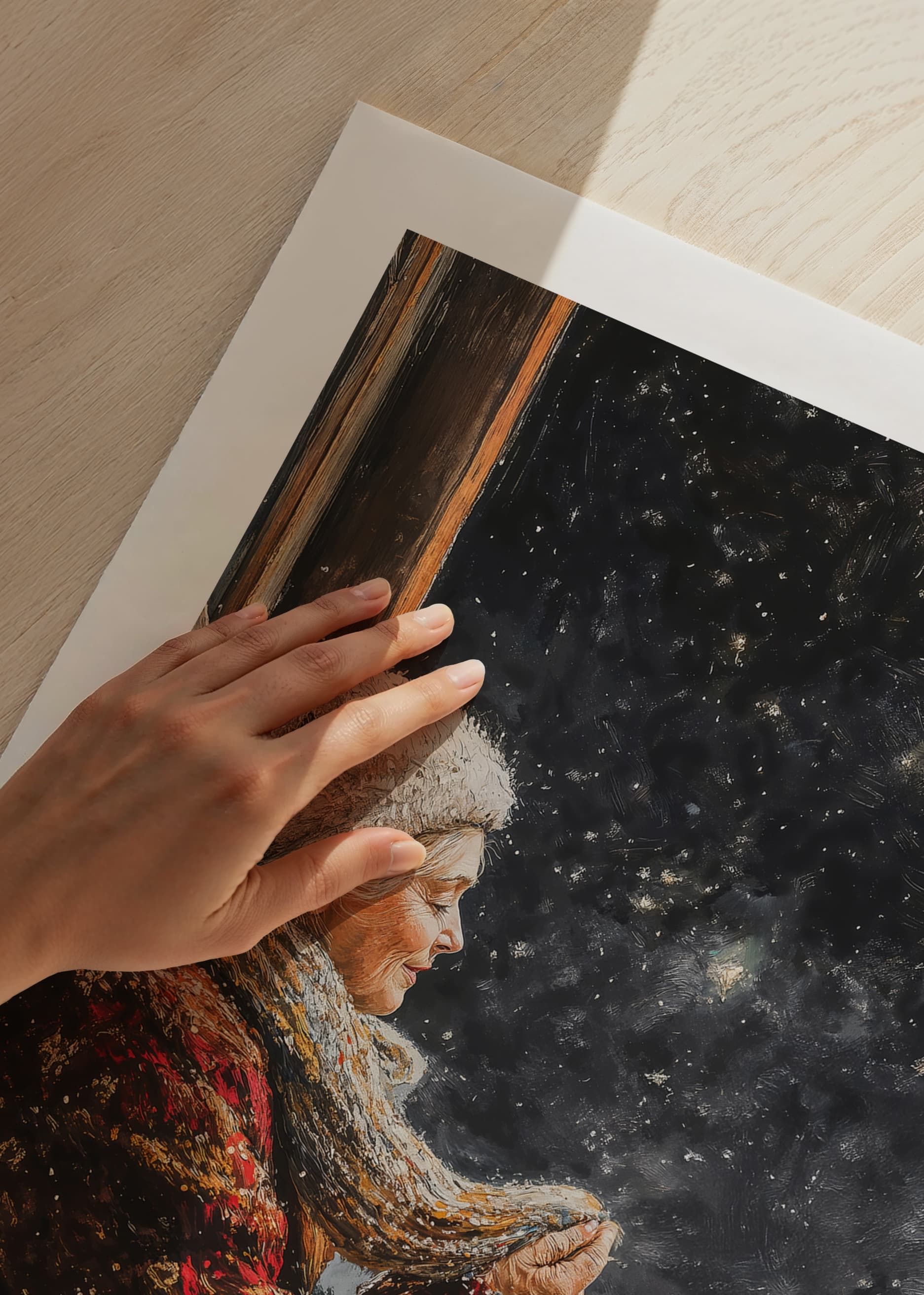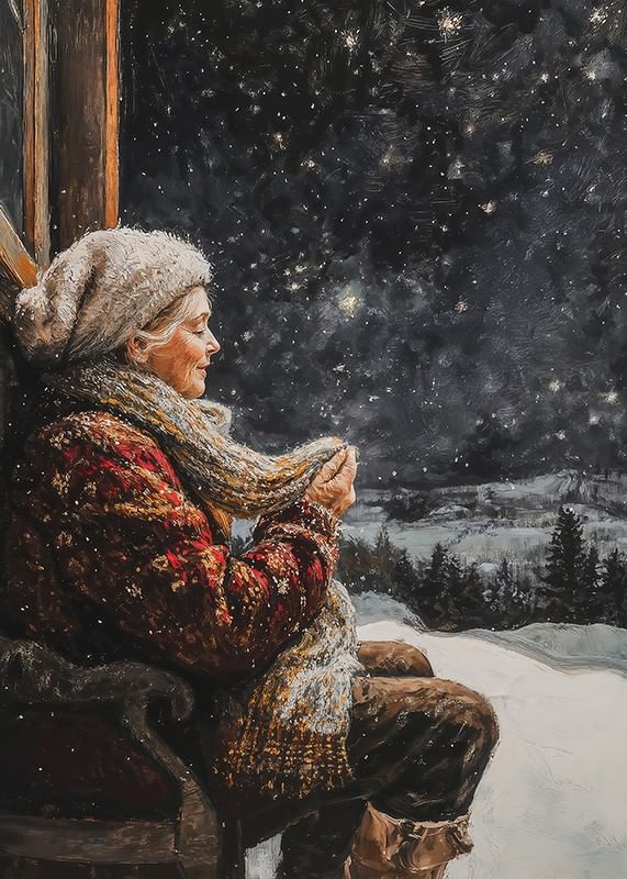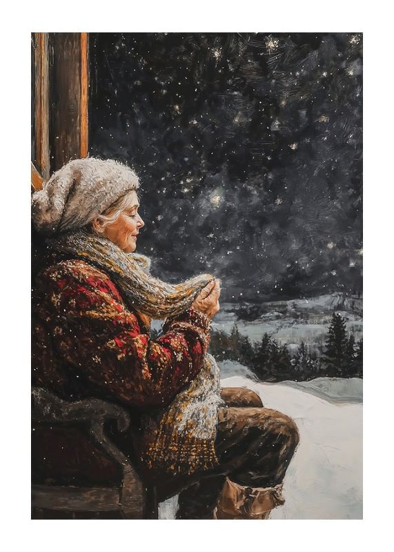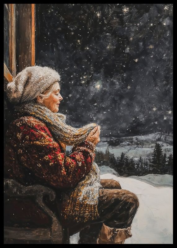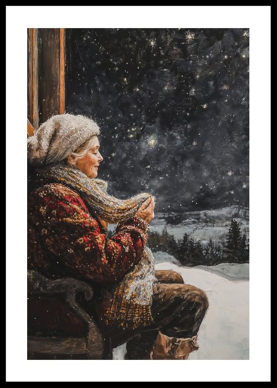 Breng de stilte van een winternacht over met deze prachtige poster! De afbeelding toont een oudere vrouw die buiten zit, gehuld in een warme sjaal en muts, en omhoog kijkt naar een sterrenhemel. De sneeuwvlokken vallen zachtjes om haar heen terwijl ze geniet van het vredige moment. Deze poster geeft de magie en de rust van de winter weer, perfect om een ​​harmonieuze en doordachte sfeer in je huis te creëren.