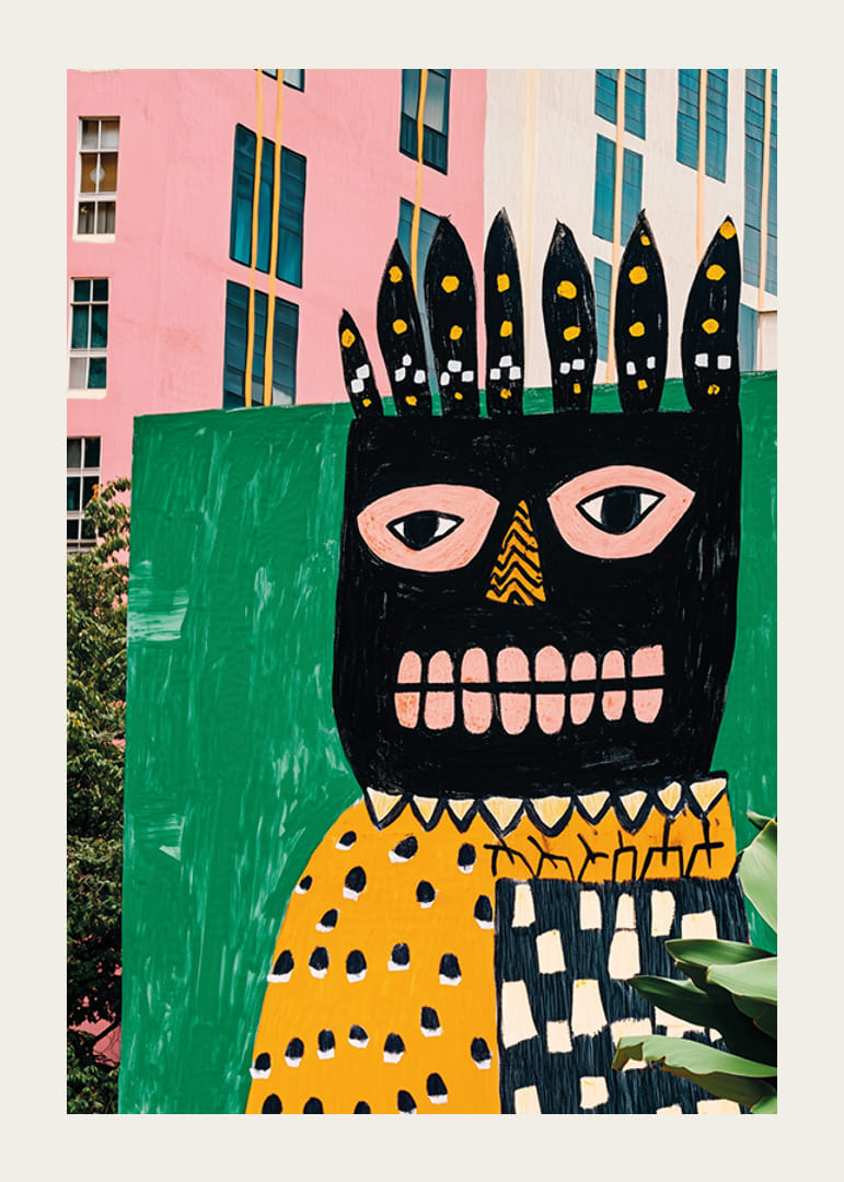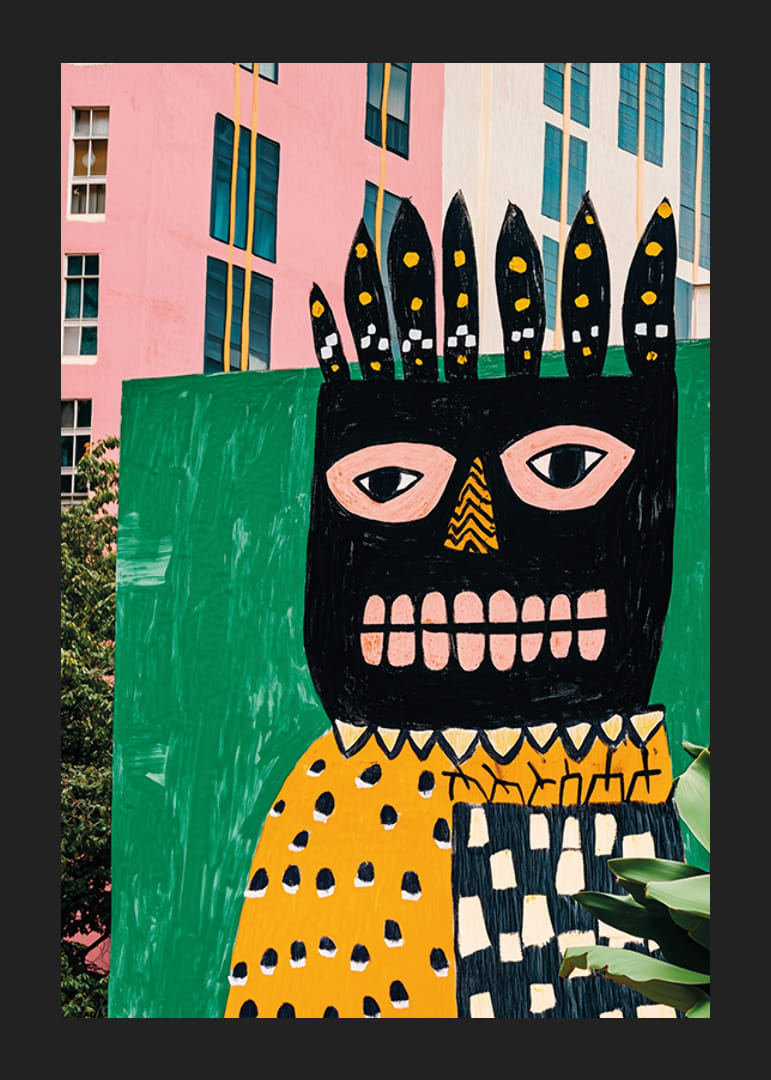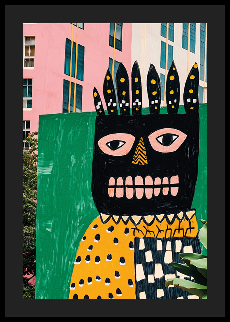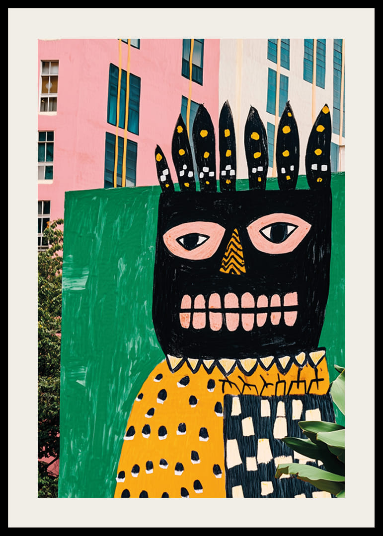Ervaar de gedurfde energie van deze moderne poster, waarop een kleurrijke muurschildering in roze en groene tinten de eentonigheid van de stad doorbreekt. Het speelse en expressieve kunstwerk valt op door de unieke vormen en gedurfde contrasten.