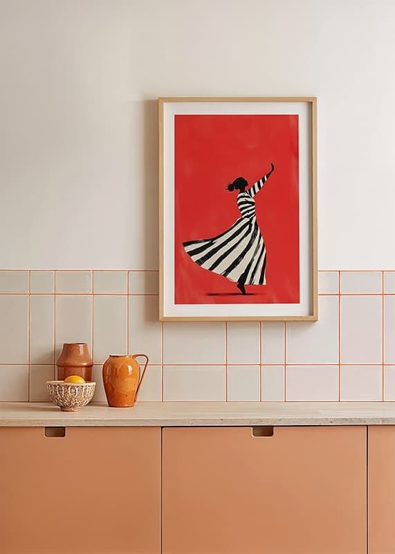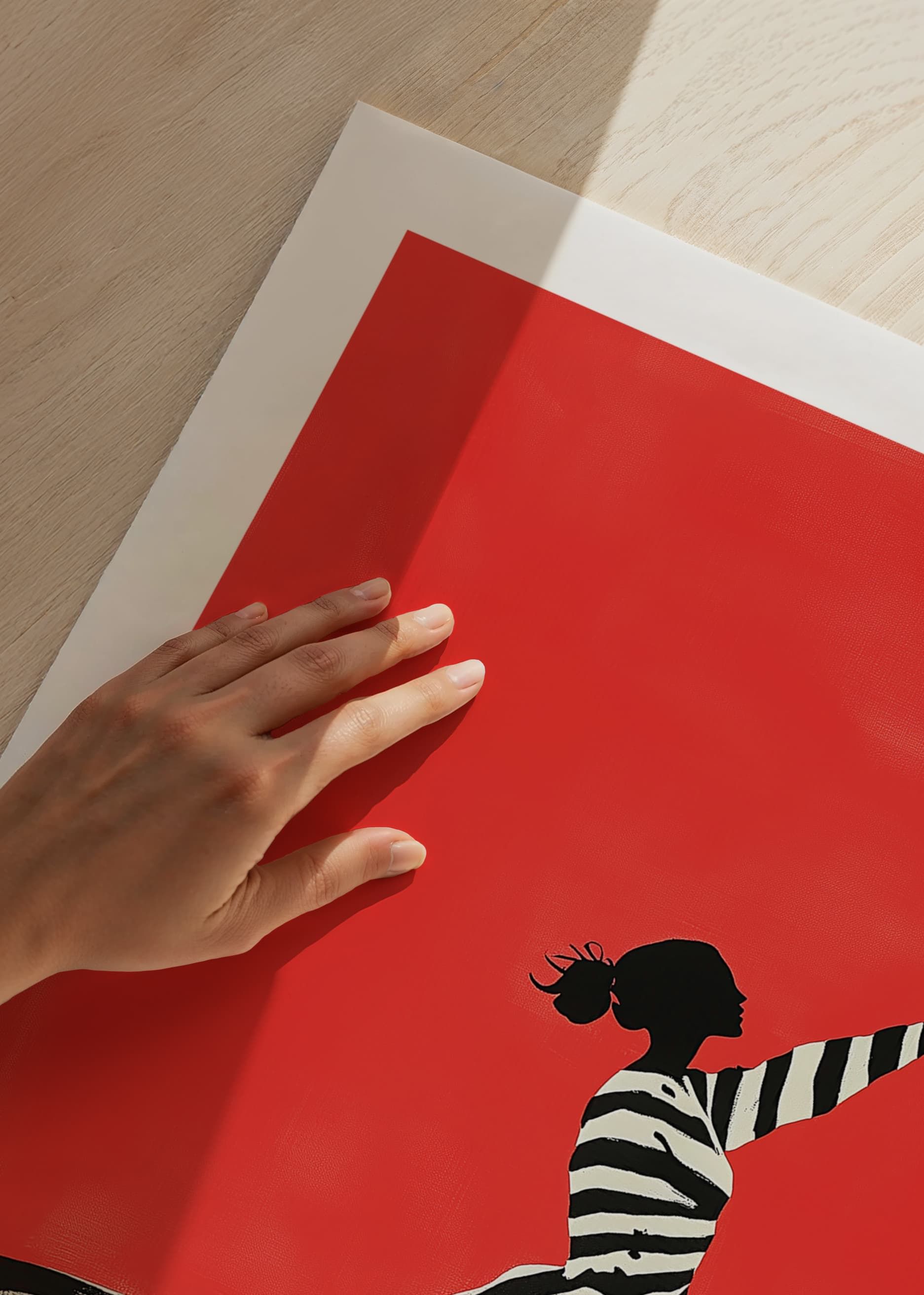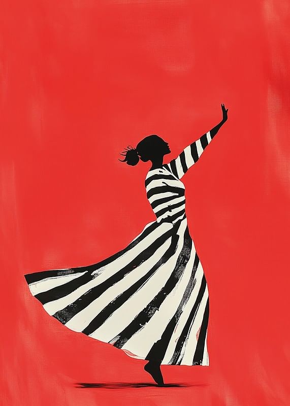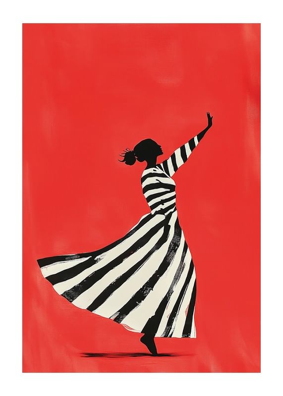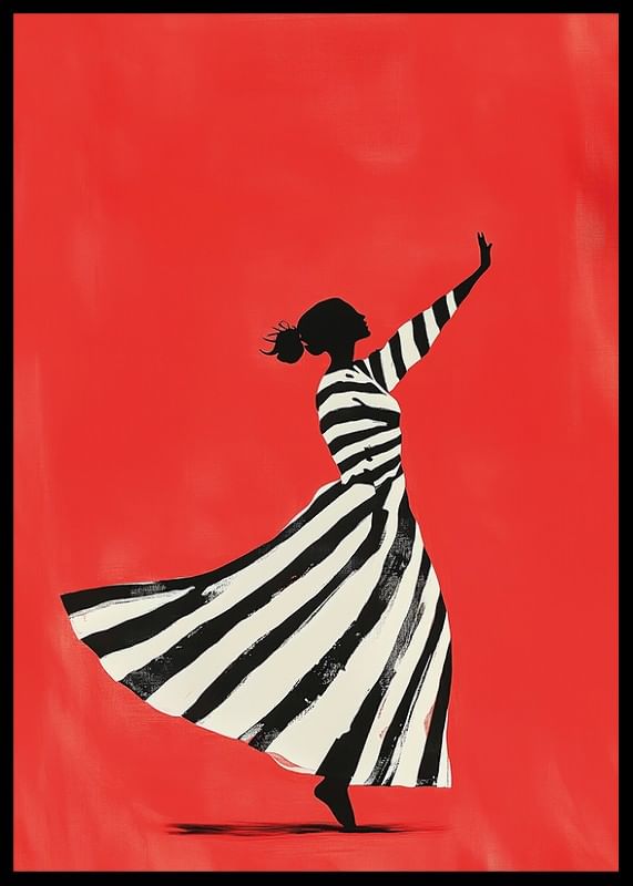 Ervaar de hypnotiserende elegantie van deze schitterende poster, waarop het silhouet van een danseres in volle beweging is vastgelegd tegen een opvallende rode achtergrond. De zwart-witte jurk en de sierlijke pose symboliseren vrijheid en expressiviteit, en creëren een gevoel van beweging en passie.