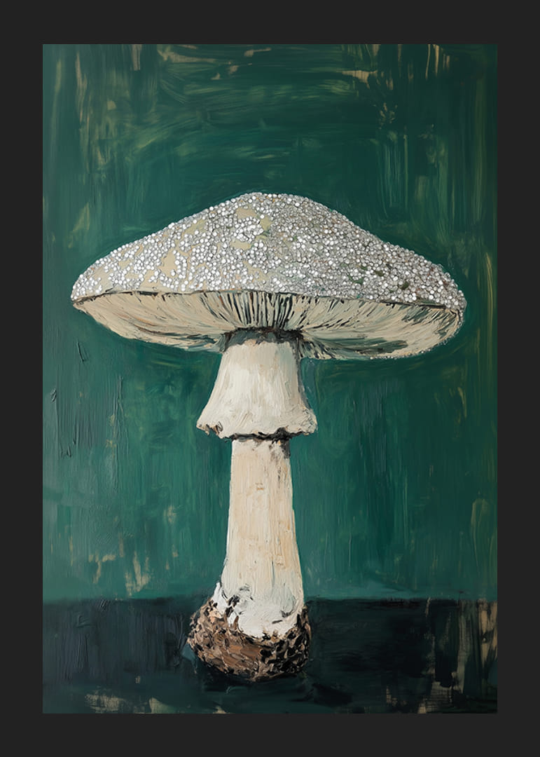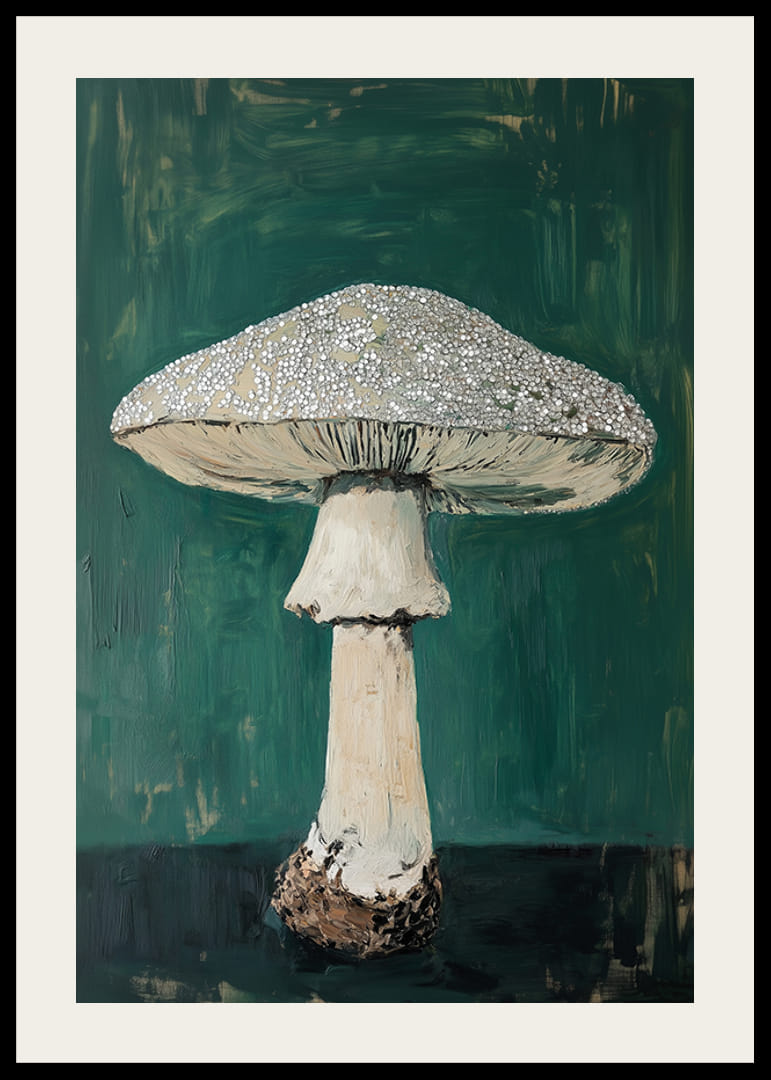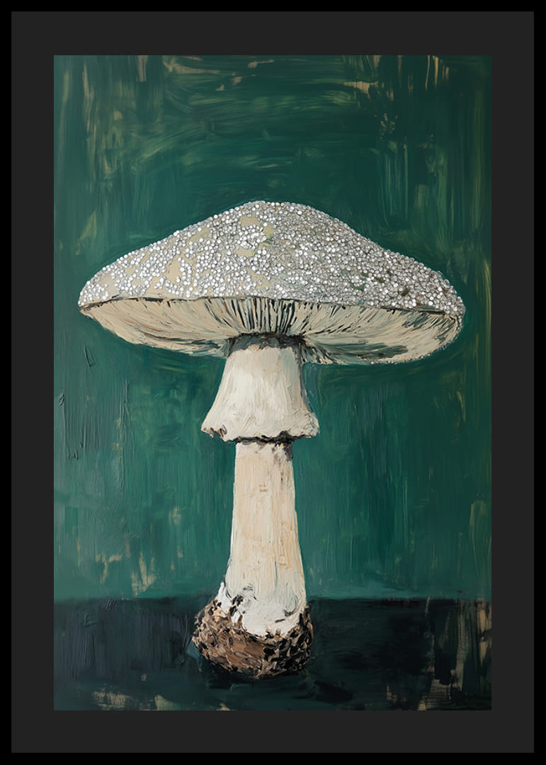 Beleef het mysterie van het bos met dit fascinerende schilderij van een paddenstoel. De majestueuze paddenstoel steekt af tegen de diepgroene achtergrond en roept een gevoel van rust en natuurwonder op. Het gedetailleerde oppervlak nodigt uit tot betoverende ontdekkingen.