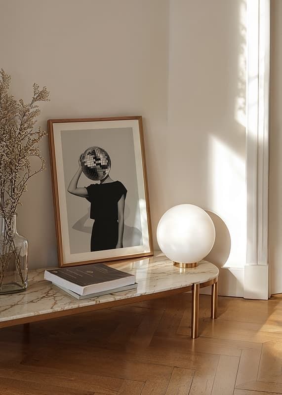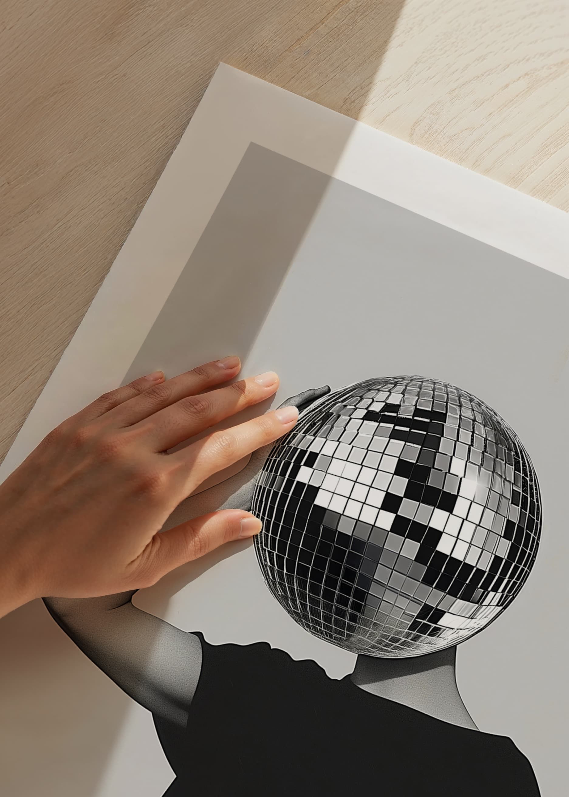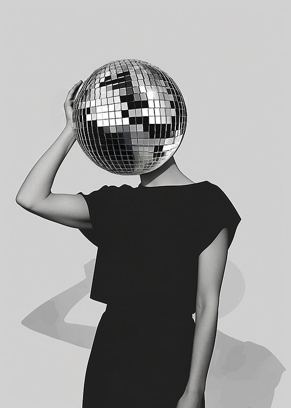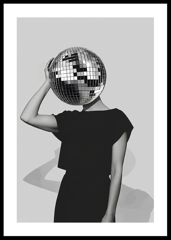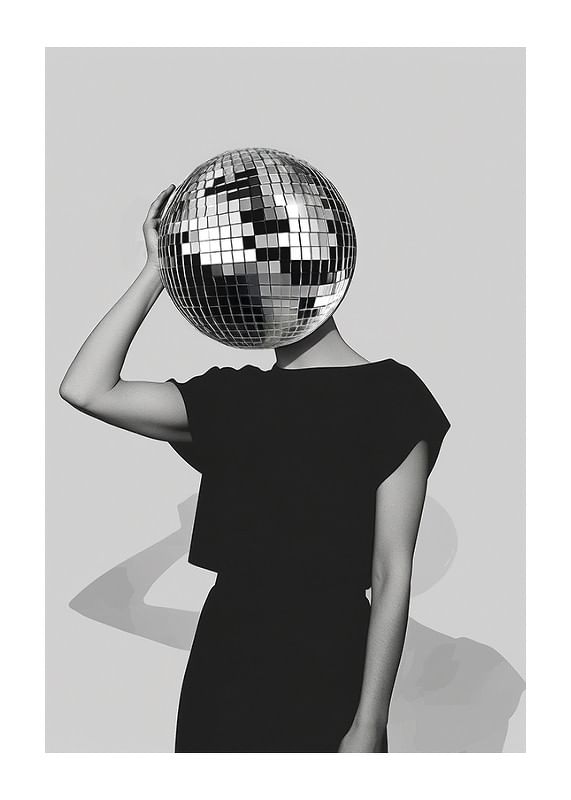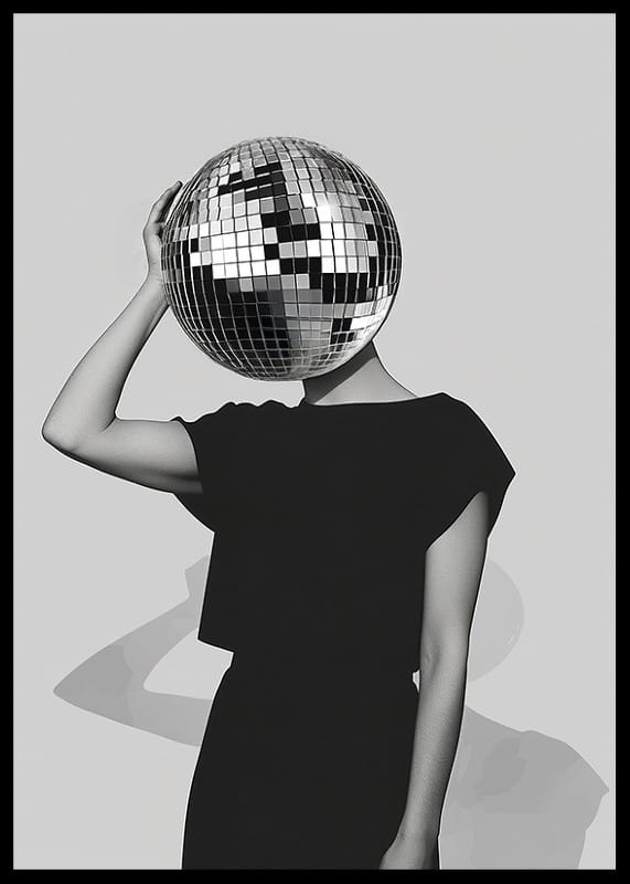 Deze poster valt op door de unieke combinatie van mysterie en elegantie. Een figuur gekleed in een elegante zwarte jurk draagt ​​een discobal als hoofd, wat een fascinerend contrast vormt met de grijze achtergrond.